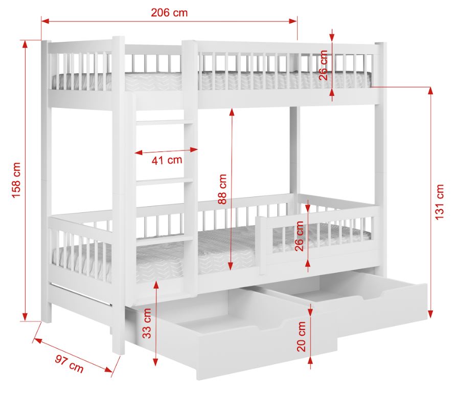 Dětská postel z masivu borovice COEN patří mezi dětské postele, které vás zaujmou nejen svým krásným vzhledem, ale také praktičností. Postele z této řady jsou velmi pečlivě vyrobeny, mají robustní konstrukci a jsou propracovány do posledního detailu. Borovicové dřevo, které se k jejich výrobě používá, je té nejvyšší kvality bez použití lepených desek. Postel je odolná proti poškrábání a to díky třem vrstvám ekologického laku. Lak je bez zápachu a vyznačuje se vynikající světlostálostí. K posteli dodáváme dva samostatné menší prostorné šuplíky s gumovými kolečky, kde můžete uložit věci nebo hračky všeho druhu. Patrovou postel můžete rozdělit na dvě samostatná lůžka.