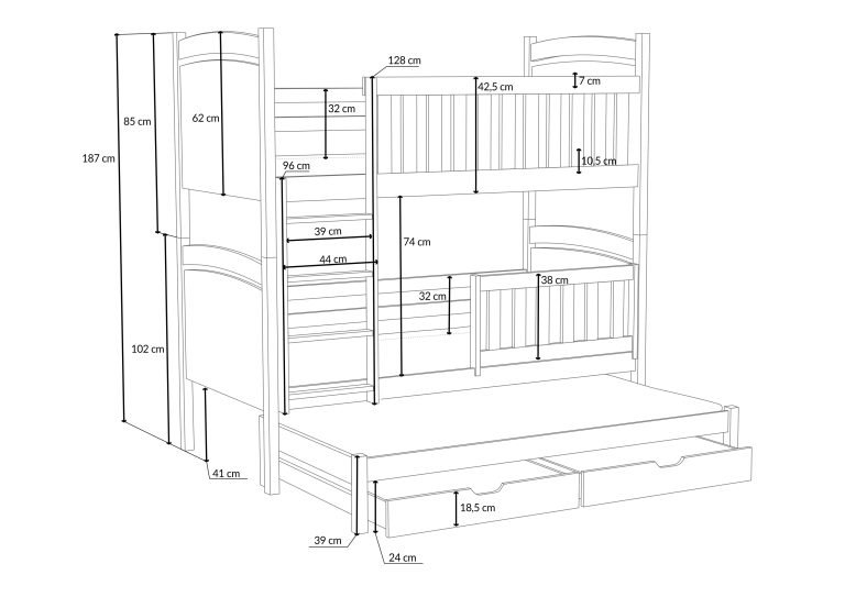 Patrová postel s výsuvnou přistýlkou Adriana je skvělým řešením do dětského pokoje sourozenců. Výsuvná přistýlka navíc poskytne pohodlné místo na spaní pro dalšího kamaráda nebo návštěvu. Postel je vyrobena z kvalitního borovicového dřeva, které je pevné a odolné. U bočnic a čel je šířka použitého materiálu 2,6 cm. Dřevo je pokryto hypoalergenním lakem na vodní bázi, který je bezpečný pro všechny členy domácnosti. Patrová postel Adriana poskytne úsporu místa, ale také naprostou bezpečnost i při častém vstupu a výstupu z horního patra díky žebříku s pohodlnými nášlapy. Dodatečnou ochranu zajišťují vysoké bariéry na horním i spodním lůžku, spodní bariérka je navíc odnímatelná a lze ji umístit k čelu postele jak z pravé, tak i z levé strany. Čela postele jsou zaoblená a dostatečně vysoká, aby poskytla potřebnou ochranu a bezpečí během spánku. Navíc jsou vybavená za sucha stíratelnými deskami, které poskytují maximální zábavu a děti budou dokonce moci každý den měnit výzdobu svého pokoje! Postel je dodávána včetně dvou praktických šuplíků, které slouží k uložení lůžkovin nebo hraček. Postel je dodávána včetně tří pevných laťkových roštů.