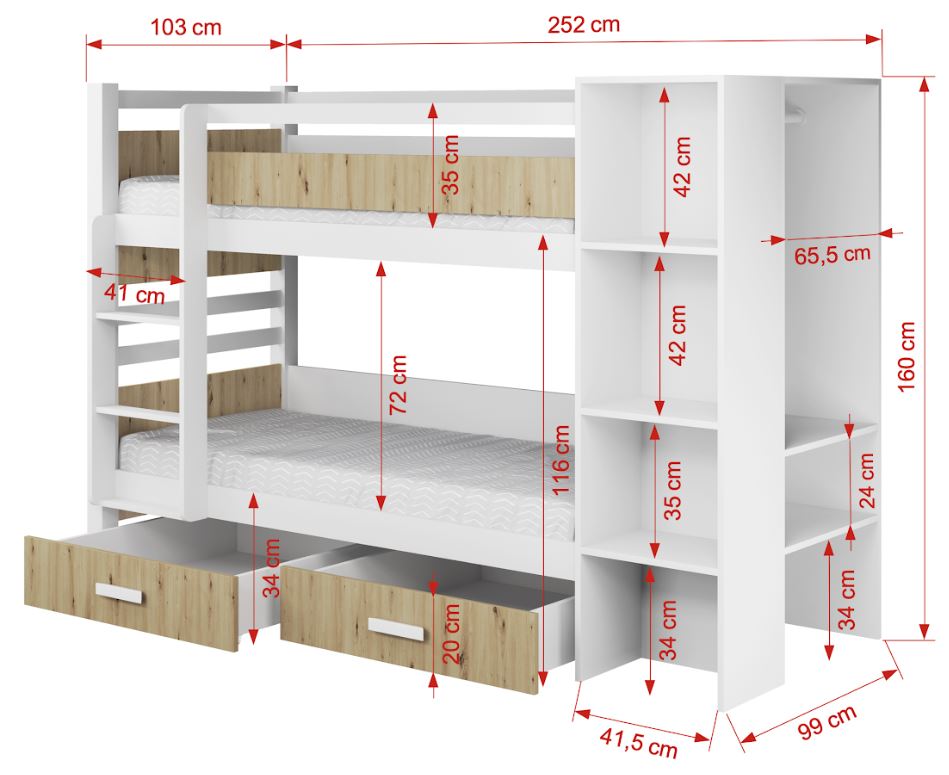 Maximální doporučené zatížení postele je 80 kg na horní lůžko a 120 kg na spodní lůžko. Konstrukce postele je uzpůsobena tak, aby zabránila pádu dítěte, a to díky ochranné bariérce. Vaše dítě se tak bude cítit v klidu a bezpečí. Součástí postele je pevný žebřík umístěný na pravé nebo levé straně postele. Dětská patrová postel vytváří komplexní prvek, který se bude vyjímat v každém dětském pokoji. Patrová postel APOLLO nejen šetří místo v pokoji, ale zároveň poskytuje plnohodnotný prostor pro spánek a odpočinek pro dvě děti.