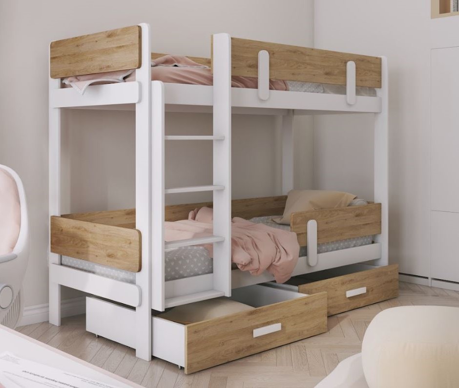 Dětská patrová postel z masivu borovice ETTORE se šuplíky - 200x90 cm - bílá/dub shetland