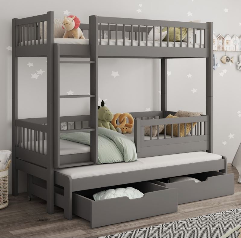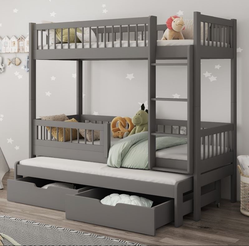 Dětská patrová postel z masivu borovice EVAN s přistýlkou a šuplíky - 180x80 cm - grafitová