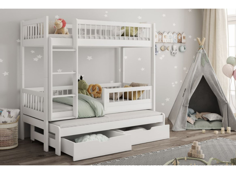 Dětská patrová postel z masivu borovice EVAN s přistýlkou a šuplíky - 200x90 cm - bílá