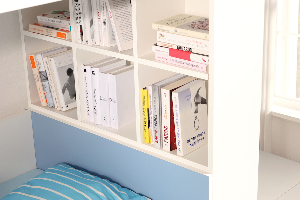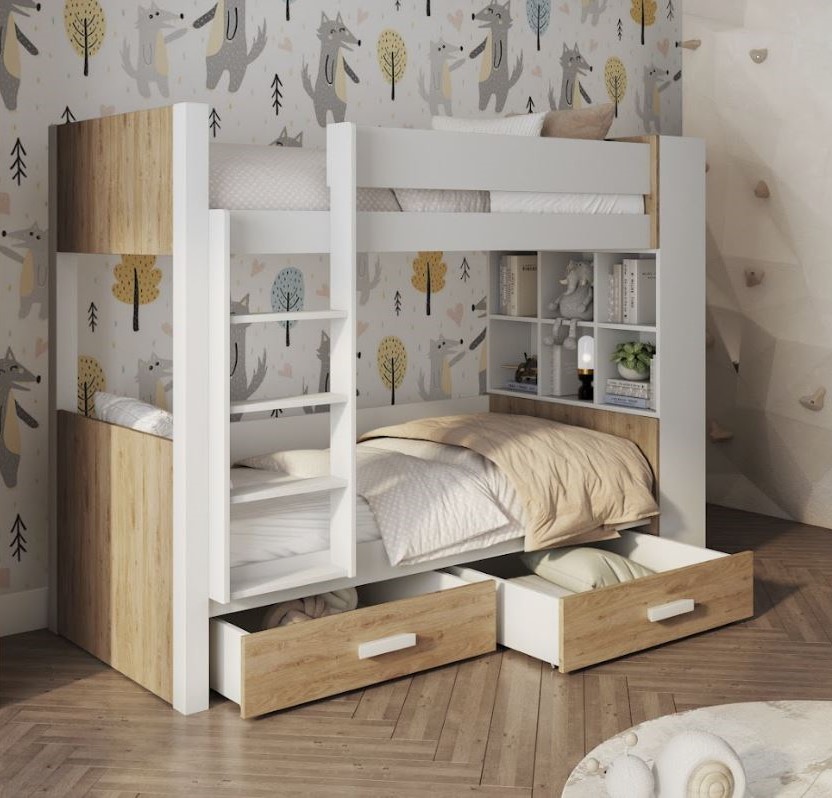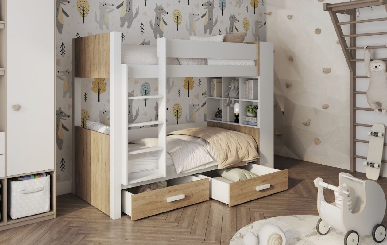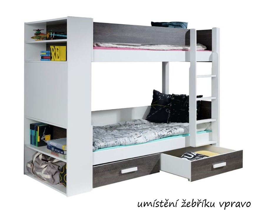 Moderní vzhled postele GASPAR předurčuje tento model především mladým lidem. Díky jednoduchému tvaru se perfektně hodí do každého moderního interiéru. Tato postel je vyrobena z kombinace borovicového dřeva a laminované desky. Konstrukční prvky jako nohy, žebřík a bočnice na straně žebříku jsou vyrobeny z pečlivě vybraného borovicového dřeva. Tato postel se vyznačuje nejen moderním designem, ale také svou funkčností díky zakomponování polic do konstrukce postele. Toto řešení umožnilo získat velmi odolnou a praktickou konstrukci a mnoho úložných prostor pro knihy, které tak budete mít stále po ruce. Postel je odolná proti poškrábání a to díky třem vrstvám ekologického laku. Lak je bez zápachu a vyznačuje se vynikající světlostálostí. K posteli dodáváme dva samostatné menší prostorné šuplíky s gumovými kolečky, kde můžete uložit lůžkoviny nebo hračky všeho druhu.