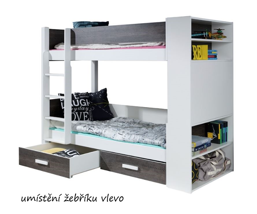 Moderní vzhled postele GASPAR předurčuje tento model především mladým lidem. Díky jednoduchému tvaru se perfektně hodí do každého moderního interiéru. Tato postel je vyrobena z kombinace borovicového dřeva a laminované desky. Konstrukční prvky jako nohy, žebřík a bočnice na straně žebříku jsou vyrobeny z pečlivě vybraného borovicového dřeva. Tato postel se vyznačuje nejen moderním designem, ale také svou funkčností díky zakomponování polic do konstrukce postele. Toto řešení umožnilo získat velmi odolnou a praktickou konstrukci a mnoho úložných prostor pro knihy, které tak budete mít stále po ruce. Postel je odolná proti poškrábání a to díky třem vrstvám ekologického laku. Lak je bez zápachu a vyznačuje se vynikající světlostálostí. K posteli dodáváme dva samostatné menší prostorné šuplíky s gumovými kolečky, kde můžete uložit lůžkoviny nebo hračky všeho druhu.