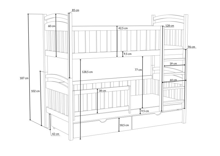 Patrová postel KRISTEN je mimořádně funkční postel, která zaujme svou pevnou konstrukcí, minimalistickou estetikou a prostorností. Postel je vyrobena z vysoce kvalitního borovicového dřeva, díky čemuž bude sloužit po mnoho let a poskytne místo pro hraní a odpočinek. Postel je velmi pevná a odolná proti poškození. U bočnic a čel je šířka použitého materiálu 2,6 cm. Postel je ošetřena ekologickým a zdravotně neutrálním lakem na vodní bázi, který je bez zápachu a díky němuž je postel chráněna proti poškození a poškrábání. Přízemní i patrovou část postele chrání speciální zábrany s příčkami a vysokými zaoblenými čely. Oba prvky nejen chrání děti před pádem, ale také dodávají posteli zajímavý vzhled. Postel je dodávána včetně dvou praktických šuplíků, které poskytují dostatek prostoru k uložení lůžkovin. Součástí postele jsou také kvalitní rošty. Spodní lůžko je doplněno o ochrannou bariérku s možností univerzální montáže na pravou i levou stranu. Bariérku lze také zcela odstranit, jakmile ji dítě již nepotřebuje.