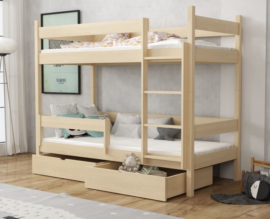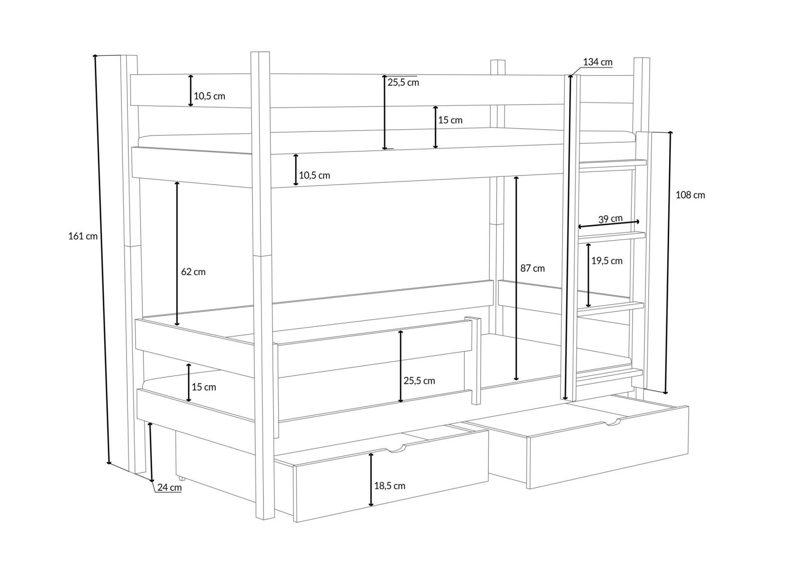 Patrová postel LEGEND je dětská postel, která osloví všechny, kteří oceňují vkusný a minimalistický vzhled. Jedná se o perfektní řešení pro sourozence, kteří sdílejí pokoj. Dětem zaručí pohodlný odpočinek a zabere poměrně malou plochu. Dvě prostorná místa na spaní a velká vzdálenost mezi rámy dávají uživatelům pocit vlastního prostoru. Patrová postel LEGEND je vybavena širokým žebříkem a ochrannou zábranou na horním lůžku, která účinně chrání před nebezpečím pádu. Patrová postel je vyrobena z masivního borovicového dřeva, které je velmi pevné a kvalitní. U bočnic a čel je šířka použitého materiálu 2,6 cm. Součástí postele jsou také kvalitní rošty. Spodní lůžko je doplněno o ochrannou bariérku s možností univerzální montáže na pravou i levou stranu. Bariérku lze také zcela odstranit, jakmile ji dítě již nepotřebuje.