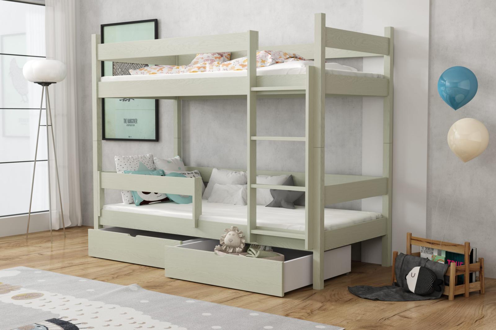 Dětská patrová postel z masivu borovice LEGEND se šuplíky - 190x90 cm - OLIVOVĚ ZELENÁ