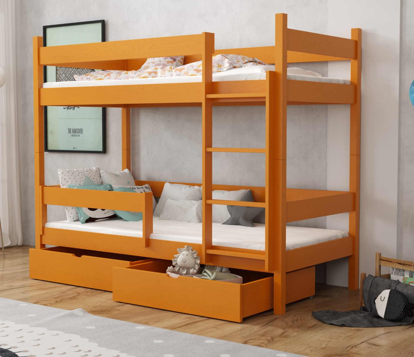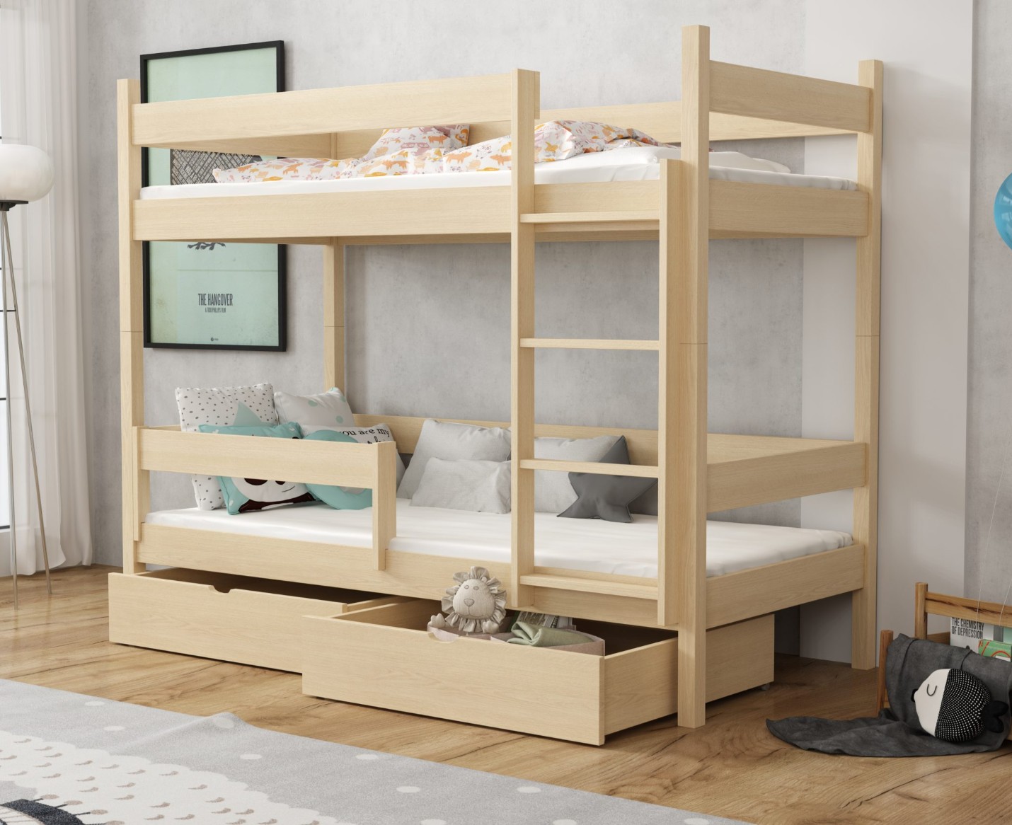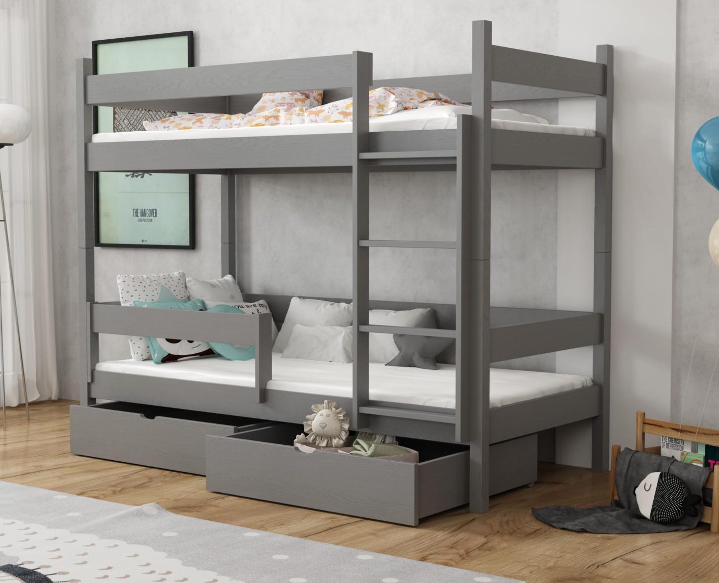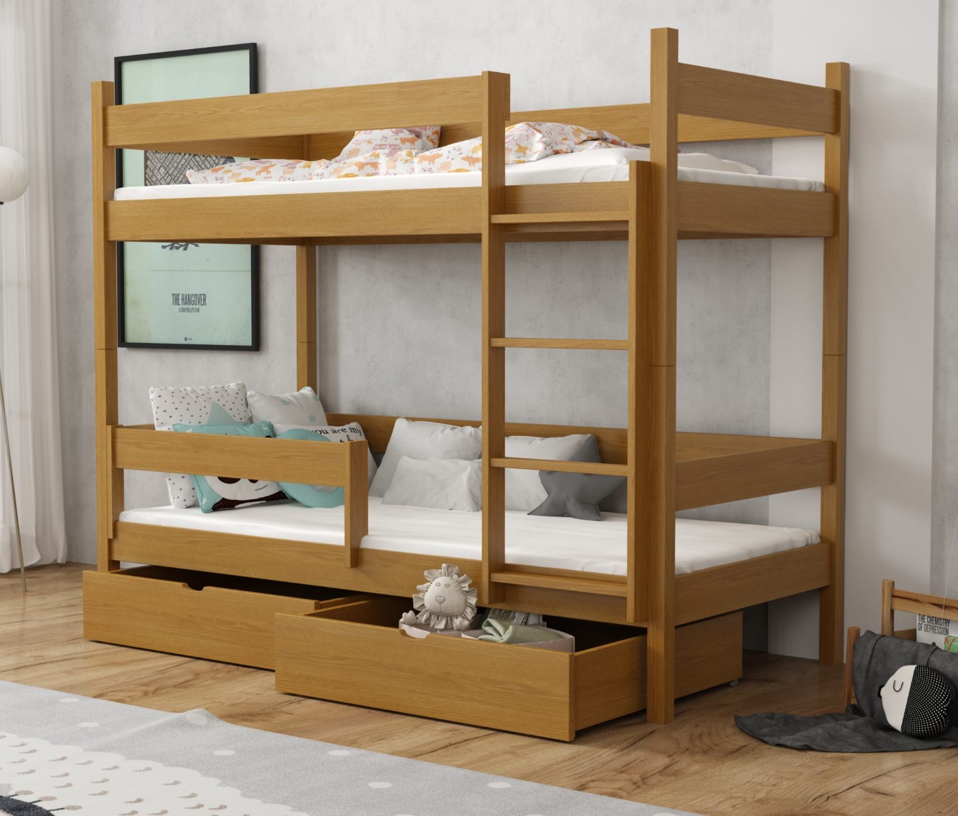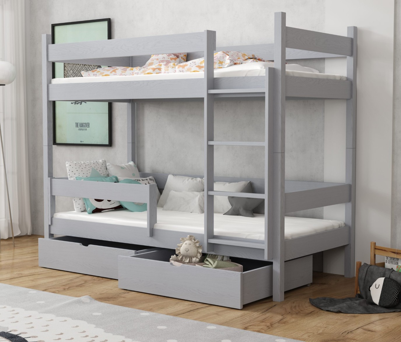 Patrová postel LEGEND je dětská postel, která osloví všechny, kteří oceňují vkusný a minimalistický vzhled. Jedná se o perfektní řešení pro sourozence, kteří sdílejí pokoj. Dětem zaručí pohodlný odpočinek a zabere poměrně malou plochu. Dvě prostorná místa na spaní a velká vzdálenost mezi rámy dávají uživatelům pocit vlastního prostoru. Patrová postel LEGEND je vybavena širokým žebříkem a ochrannou zábranou na horním lůžku, která účinně chrání před nebezpečím pádu. Patrová postel je vyrobena z masivního borovicového dřeva, které je velmi pevné a kvalitní. U bočnic a čel je šířka použitého materiálu 2,6 cm. Postel nabízíme v několika barevných variantách, případně bez povrchových úprav. Surové dřevo nabízí přirozený vzhled. Postel je ekologická, odolná a lze ji snadno přizpůsobit - její vzhled můžete upravit mořením, lakováním nebo malováním dle vlastního uvážení. Barevné varianty jsou ošetřeny ekologickým lakem bez zápachu, který zvyšuje odolnost postele proti poškrábání. Postel je dodávána včetně dvou praktických šuplíků, které poskytují dostatek prostoru k uložení lůžkovin. Součástí postele jsou také kvalitní rošty. Spodní lůžko je doplněno o ochrannou bariérku s možností univerzální montáže na pravou i levou stranu. Bariérku lze také zcela odstranit, jakmile ji dítě již nepotřebuje.