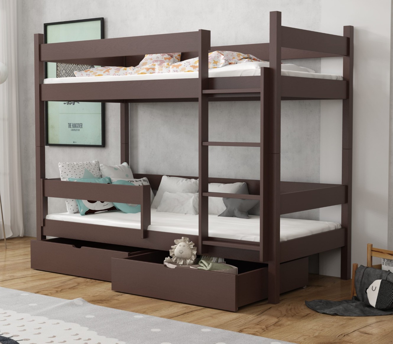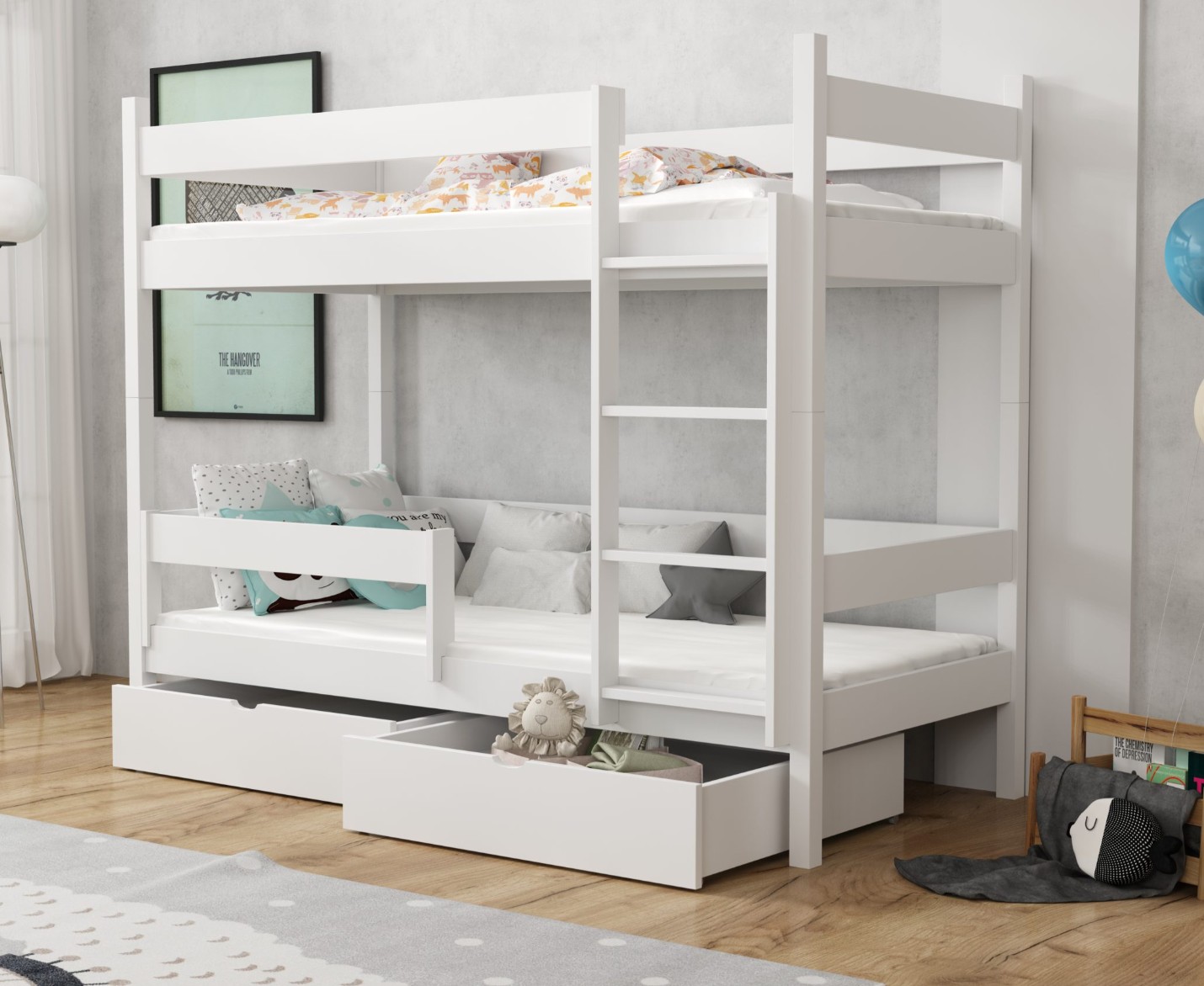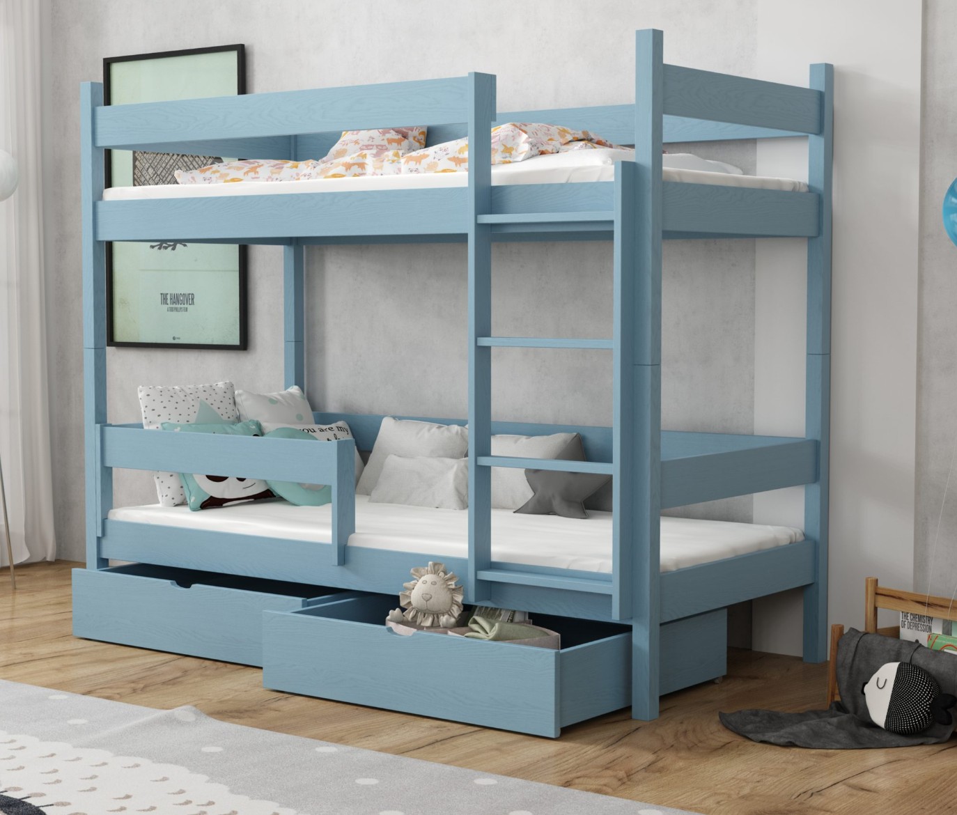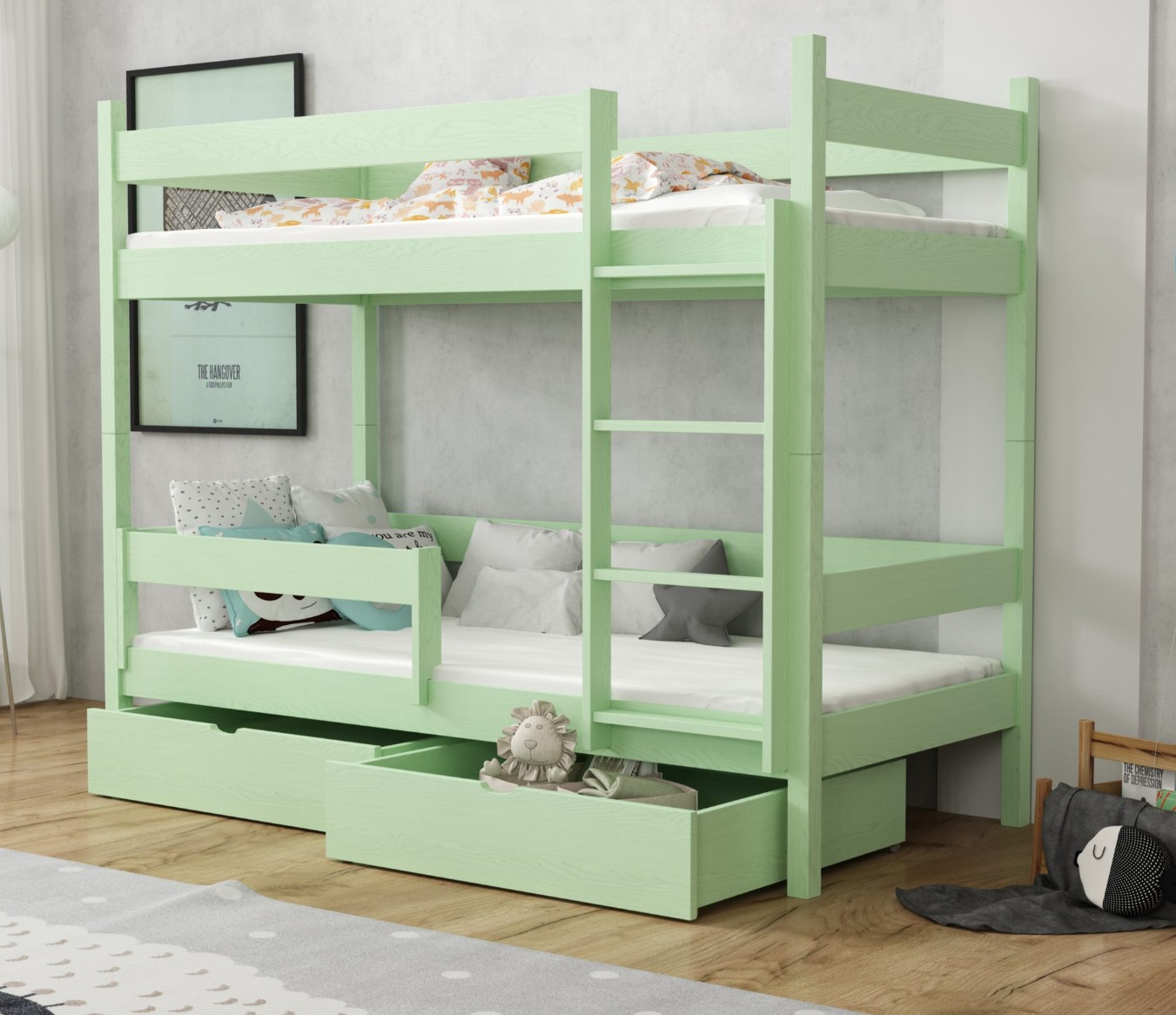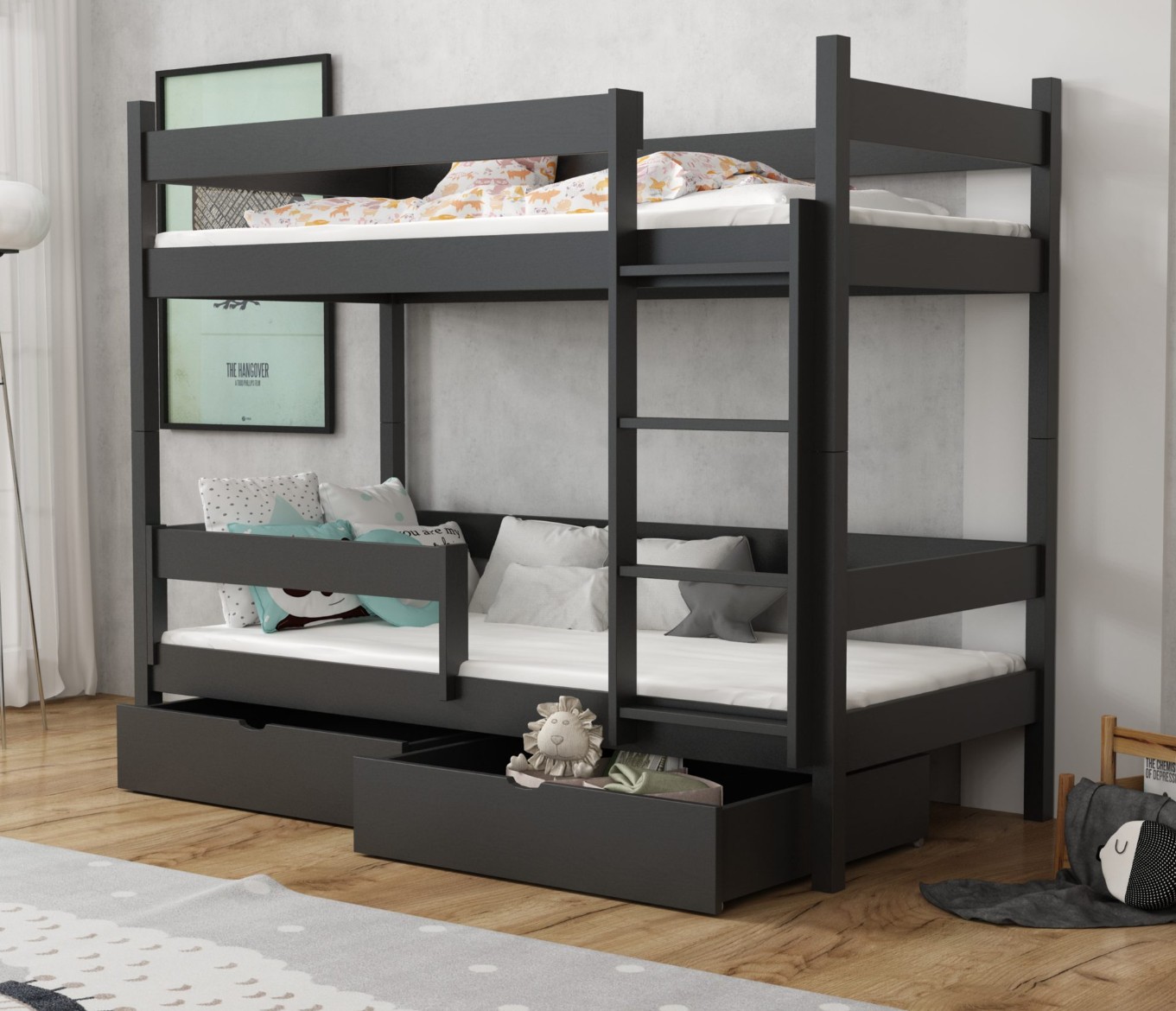 Patrová postel LEGEND je dětská postel, která osloví všechny, kteří oceňují vkusný a minimalistický vzhled. Jedná se o perfektní řešení pro sourozence, kteří sdílejí pokoj. Dětem zaručí pohodlný odpočinek a zabere poměrně malou plochu. Dvě prostorná místa na spaní a velká vzdálenost mezi rámy dávají uživatelům pocit vlastního prostoru. Patrová postel LEGEND je vybavena širokým žebříkem a ochrannou zábranou na horním lůžku, která účinně chrání před nebezpečím pádu. Patrová postel je vyrobena z masivního borovicového dřeva, které je velmi pevné a kvalitní. U bočnic a čel je šířka použitého materiálu 2,6 cm. Postel nabízíme v několika barevných variantách, případně bez povrchových úprav. Surové dřevo nabízí přirozený vzhled. Postel je ekologická, odolná a lze ji snadno přizpůsobit - její vzhled můžete upravit mořením, lakováním nebo malováním dle vlastního uvážení. Barevné varianty jsou ošetřeny ekologickým lakem bez zápachu, který zvyšuje odolnost postele proti poškrábání. Postel je dodávána včetně dvou praktických šuplíků, které poskytují dostatek prostoru k uložení lůžkovin. Součástí postele jsou také kvalitní rošty. Spodní lůžko je doplněno o ochrannou bariérku s možností univerzální montáže na pravou i levou stranu. Bariérku lze také zcela odstranit, jakmile ji dítě již nepotřebuje.