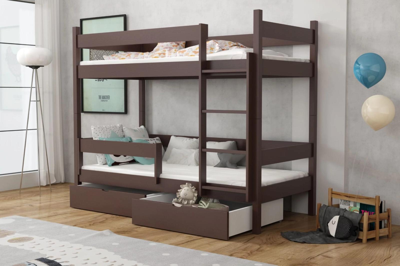 Patrová postel LEGEND je dětská postel, která osloví všechny, kteří oceňují vkusný a minimalistický vzhled. Jedná se o perfektní řešení pro sourozence, kteří sdílejí pokoj. Dětem zaručí pohodlný odpočinek a zabere poměrně malou plochu. Dvě prostorná místa na spaní a velká vzdálenost mezi rámy dávají uživatelům pocit vlastního prostoru. Patrová postel LEGEND je vybavena širokým žebříkem a ochrannou zábranou na horním lůžku, která účinně chrání před nebezpečím pádu. Patrová postel je vyrobena z masivního borovicového dřeva, které je velmi pevné a kvalitní. U bočnic a čel je šířka použitého materiálu 2,6 cm. Postel nabízíme v několika barevných variantách, případně bez povrchových úprav. Surové dřevo nabízí přirozený vzhled. Postel je ekologická, odolná a lze ji snadno přizpůsobit - její vzhled můžete upravit mořením, lakováním nebo malováním dle vlastního uvážení. Barevné varianty jsou ošetřeny ekologickým lakem bez zápachu, který zvyšuje odolnost postele proti poškrábání. Postel je dodávána včetně dvou praktických šuplíků, které poskytují dostatek prostoru k uložení lůžkovin. Součástí postele jsou také kvalitní rošty. Spodní lůžko je doplněno o ochrannou bariérku s možností univerzální montáže na pravou i levou stranu. Bariérku lze také zcela odstranit, jakmile ji dítě již nepotřebuje.