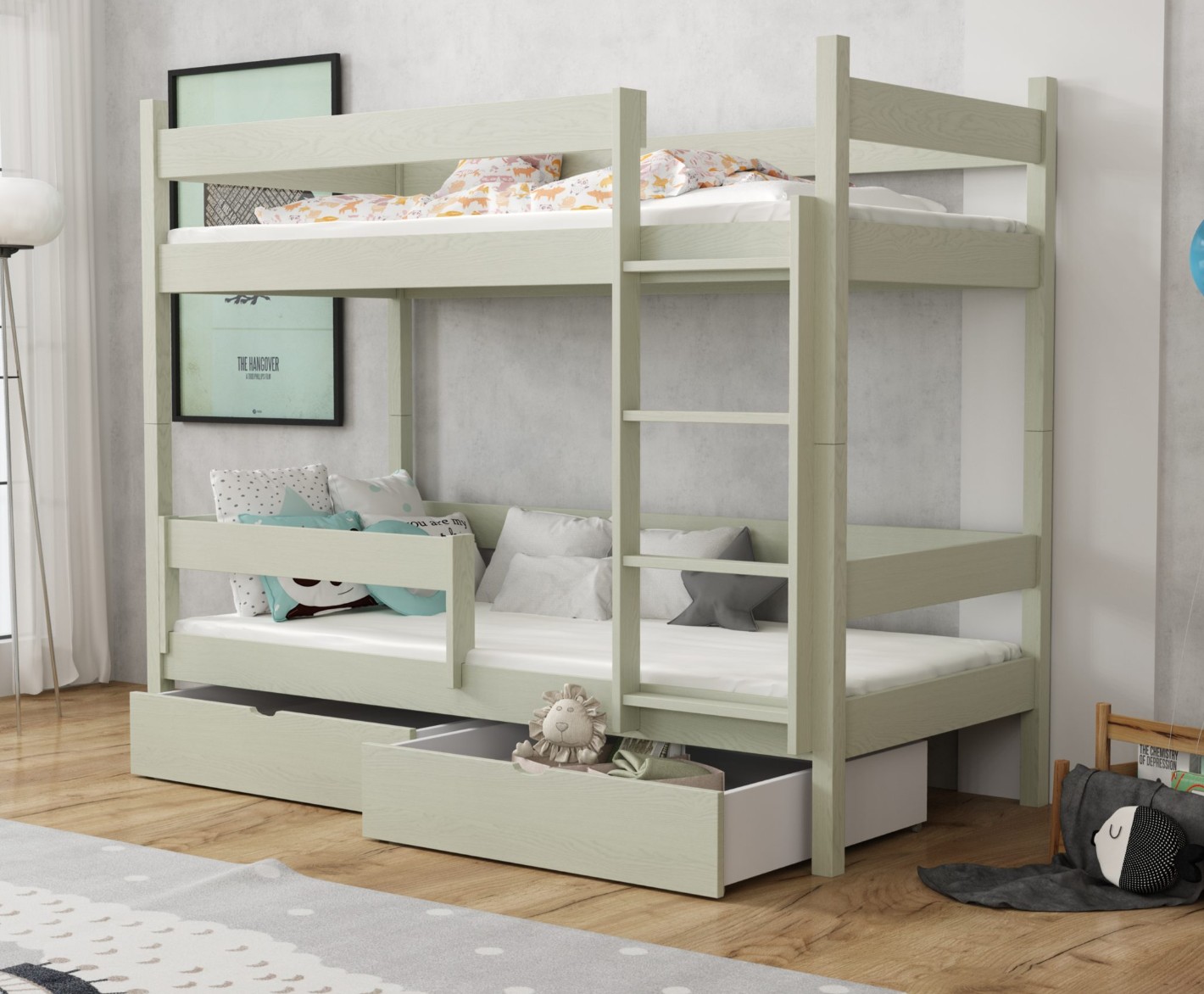 Patrová postel LEGEND je dětská postel, která osloví všechny, kteří oceňují vkusný a minimalistický vzhled. Jedná se o perfektní řešení pro sourozence, kteří sdílejí pokoj. Dětem zaručí pohodlný odpočinek a zabere poměrně malou plochu. Dvě prostorná místa na spaní a velká vzdálenost mezi rámy dávají uživatelům pocit vlastního prostoru. Patrová postel LEGEND je vybavena širokým žebříkem a ochrannou zábranou na horním lůžku, která účinně chrání před nebezpečím pádu. Patrová postel je vyrobena z masivního borovicového dřeva, které je velmi pevné a kvalitní. U bočnic a čel je šířka použitého materiálu 2,6 cm. Postel nabízíme v několika barevných variantách, případně bez povrchových úprav. Surové dřevo nabízí přirozený vzhled. Postel je ekologická, odolná a lze ji snadno přizpůsobit - její vzhled můžete upravit mořením, lakováním nebo malováním dle vlastního uvážení. Barevné varianty jsou ošetřeny ekologickým lakem bez zápachu, který zvyšuje odolnost postele proti poškrábání. Postel je dodávána včetně dvou praktických šuplíků, které poskytují dostatek prostoru k uložení lůžkovin. Součástí postele jsou také kvalitní rošty. Spodní lůžko je doplněno o ochrannou bariérku s možností univerzální montáže na pravou i levou stranu. Bariérku lze také zcela odstranit, jakmile ji dítě již nepotřebuje.