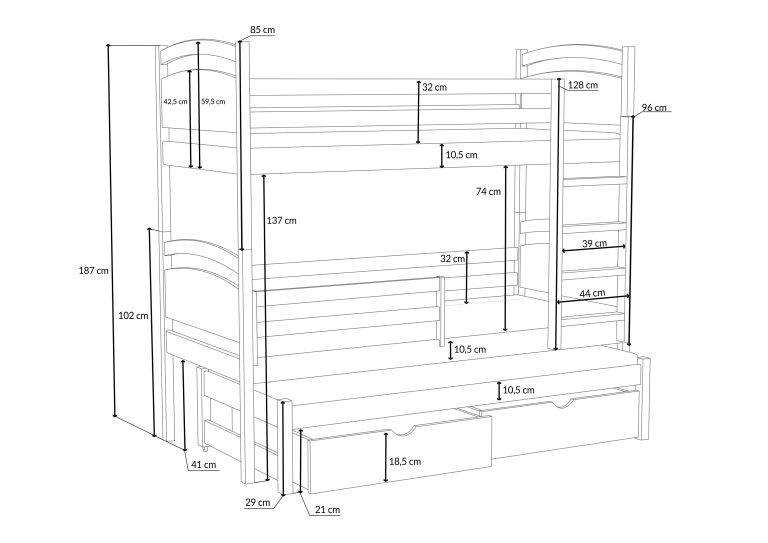 Olívie je vynikající model patrové postele s výsuvnou přistýlkou, která poskytuje pohodlné místo na spaní až třem dětem. Tento pohodlný, prostorný a spolehlivý kus nábytku udělá malým uživatelům spoustu radosti a vytvoří pro ně jedinečný a bezpečný prostor na spaní i hraní. Má dvě prostorné zásuvky, které vám pomohou udržet pořádek v dětském pokoji. Moderní a minimalistický design dokonale zapadne do každého interiéru. Olívie je velká, pohodlná a odolná postel z borovicového dřeva, která zaujme svou pevnou prostornou konstrukcí. U bočnic a čel je šířka použitého materiálu 2,6 cm. Dvě zaoblené opěrky hlavy, široký žebřík a bezpečnostní zábradlí zajišťují maximální bezpečnost při spánku i hraní. Postel je ošetřena lakem na vodní bázi, který je bezpečný a chrání postel proti poškození a poškrábání. Součástí spodní postele je také odnímatelná ochranná bariéra, kterou lze umístit k čelu postele jak z pravé strany, tak i z levé strany. Vaše dítě se tak bude cítit v klidu a bezpečí. Postel je dodávána včetně tří pevných laťkových roštů.