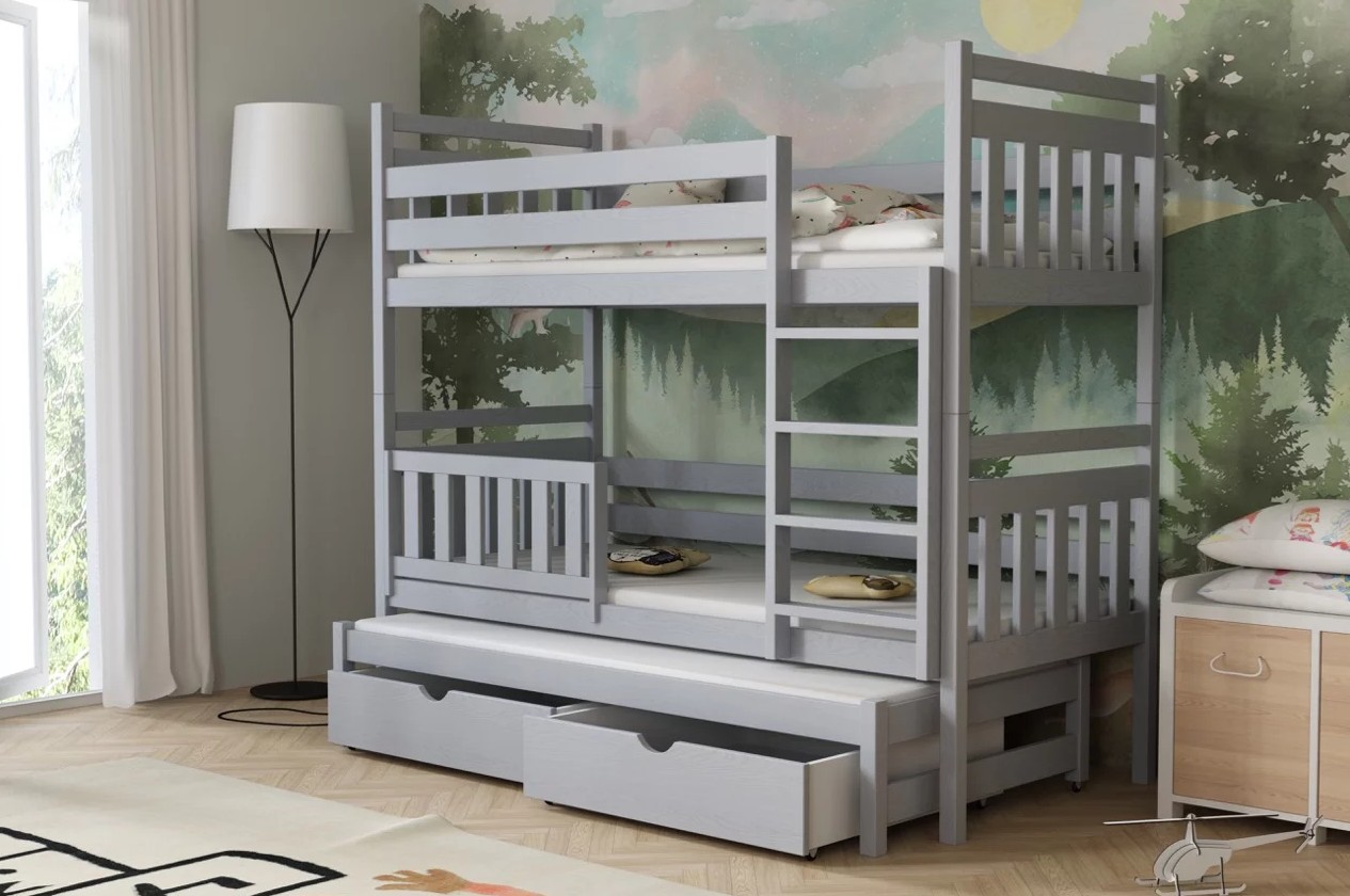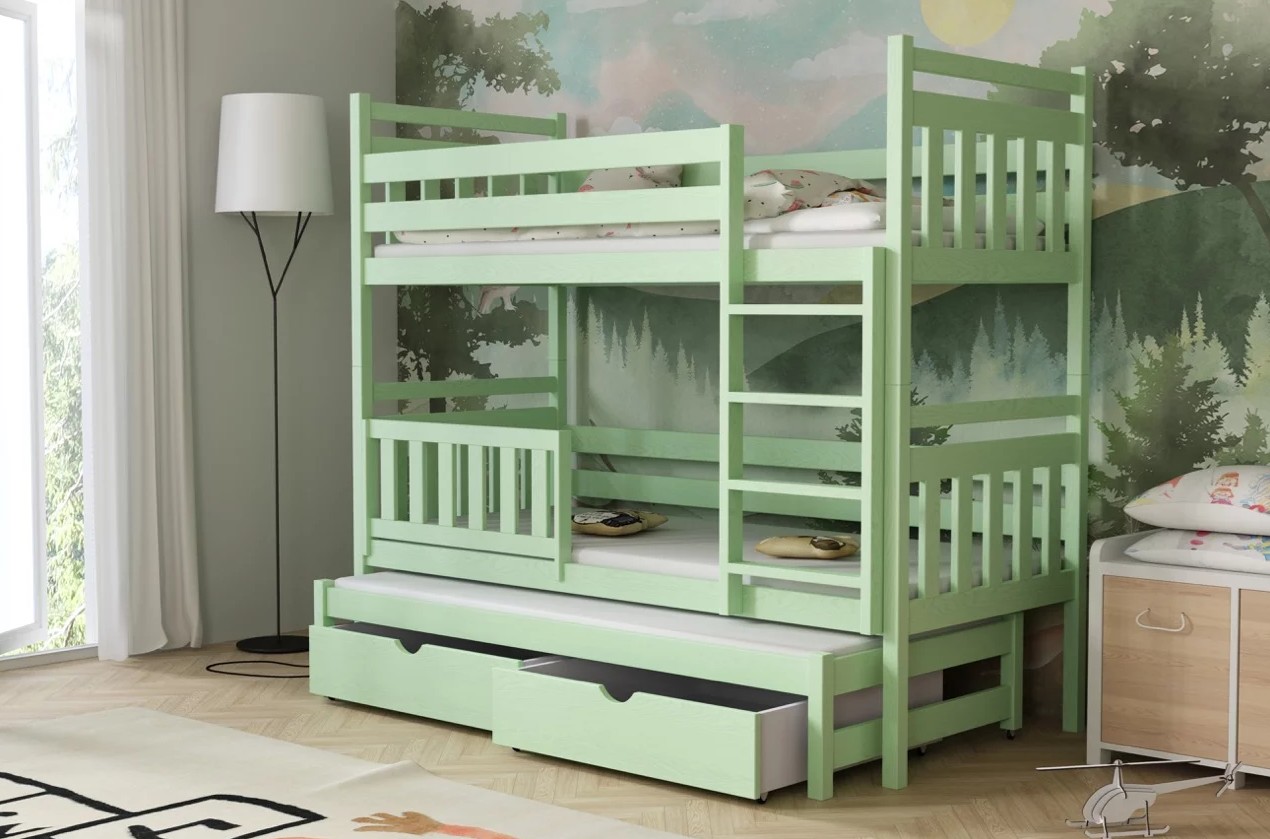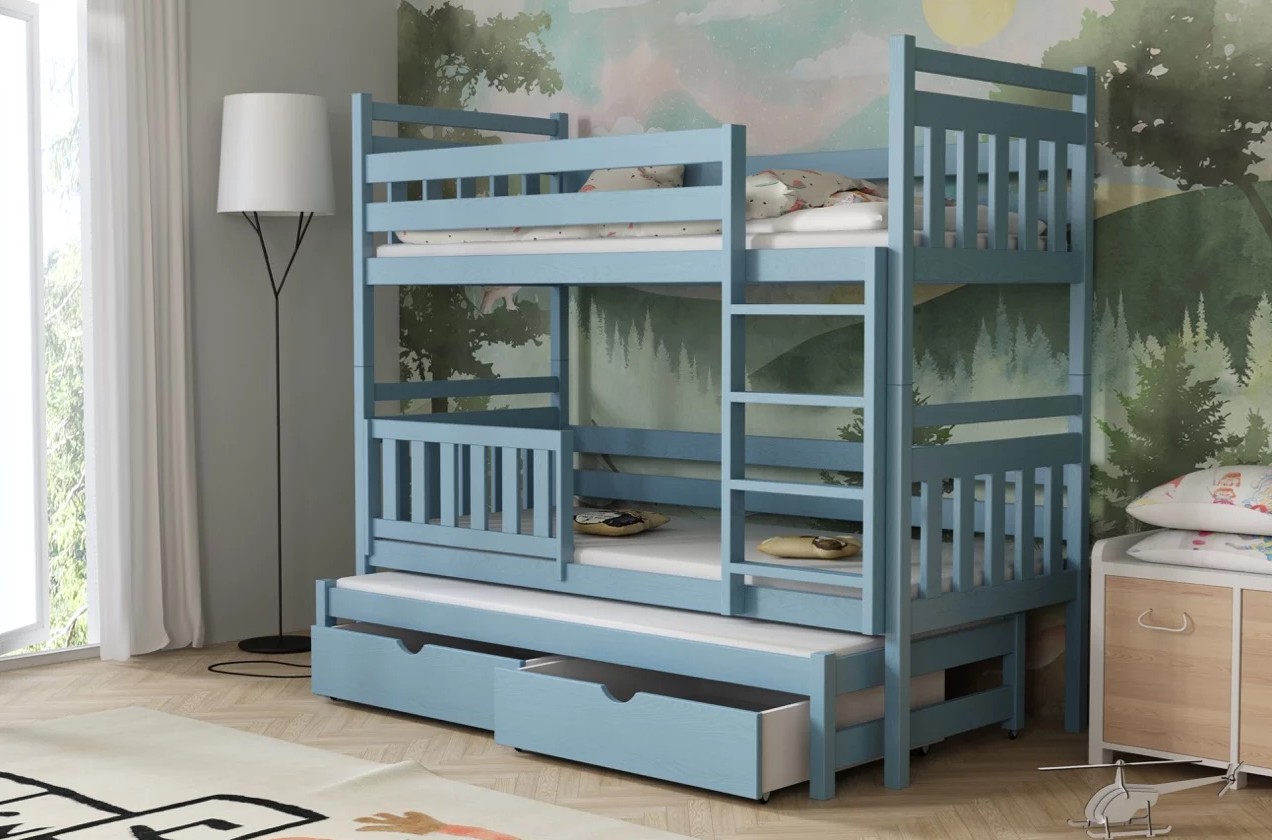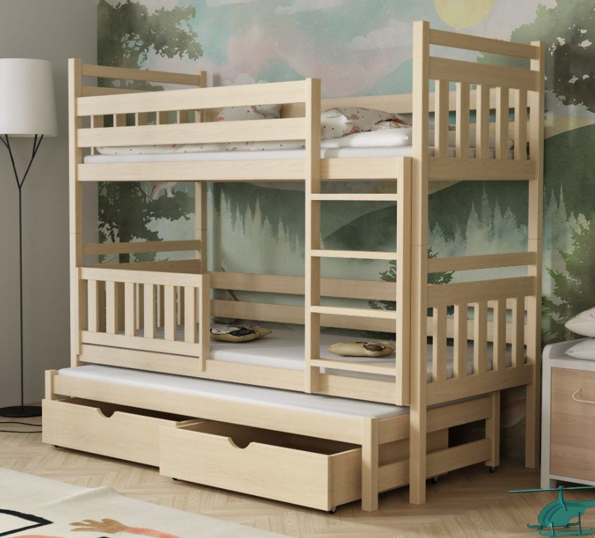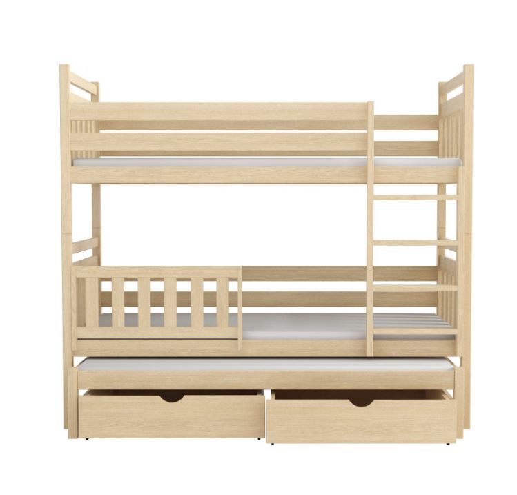 Dětská patrová postel s přistýlkou PETR je skvělou volbou pro velké rodiny, protože poskytuje pohodlné místo na spaní až pro 3 osoby. Na výsuvné přistýlce může spát nejen dítě, ale v případě potřeby i rodič nebo dospělý host. Postel PETR nahradí 3 postele v místnosti, čímž dokonale šetří místo. Navíc je postel vybavena dvěma funkčními šuplíky, které vám ušetří ještě více místa a pomáhají udržet pořádek v místnosti! Patrová postel PETR je perfektním řešením pro ty, kteří potřebují více místa na spaní a zároveň si cení funkčnosti, stylu a pohodlí. Postel skvěle vypadá a poskytuje dětem maximální bezpečí. Při výrobě byly použity jen ty nejlepší materiály včetně masivního borovicového dřeva. Tato surovina zajišťuje mimořádnou pevnost a nosnost konstrukce. U bočnic a čel je šířka použitého materiálu 2,6 cm. Díky tomu bude postel PETR sloužit ve vaší domácnosti mnoho let. Postel nabízíme v několika barevných variantách, případně bez povrchových úprav. Surové dřevo nabízí přirozený vzhled. Postel je ekologická, odolná a lze ji snadno přizpůsobit - její vzhled můžete upravit mořením, lakováním nebo malováním dle vlastního uvážení. Barevné varianty jsou ošetřeny ekologickým lakem bez zápachu, který zvyšuje odolnost postele proti poškrábání. Součástí spodní postele je také odnímatelná ochranná bariéra, kterou lze umístit k čelu postele jak z pravé strany, tak i z levé strany. Vaše dítě se tak bude cítit v klidu a bezpečí. Součástí postele je pevný žebřík s pohodlnými širokými nášlapy, který lze při montáži umístit jak na levou, tak i pravou stranu postele.