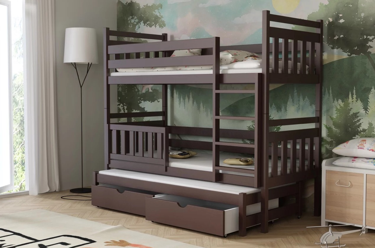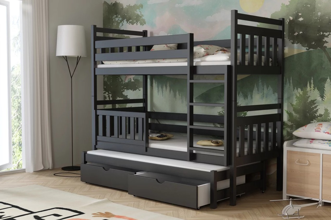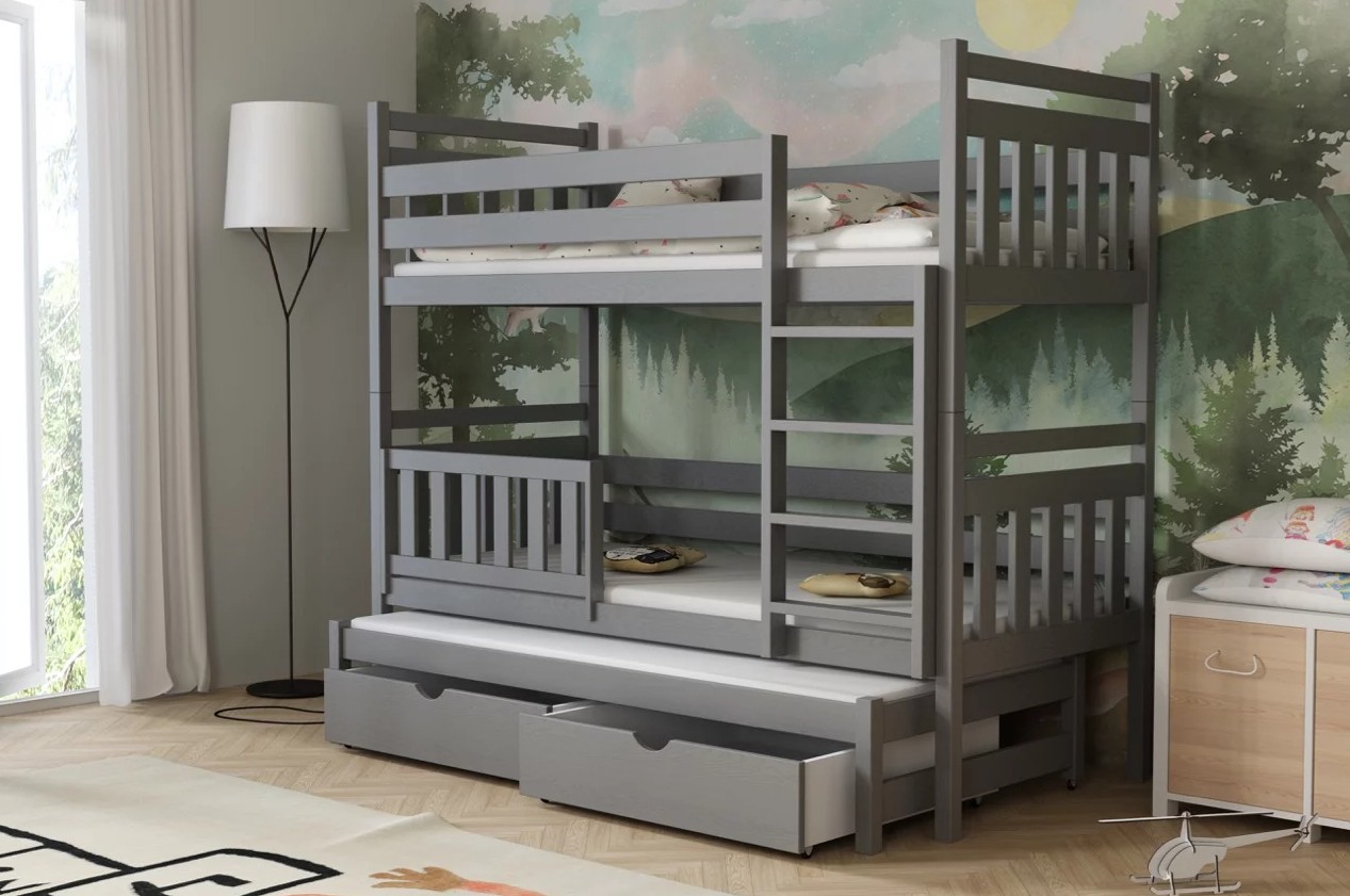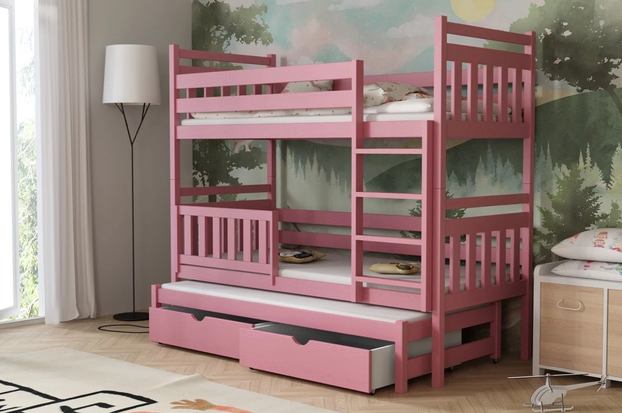 Dětská patrová postel s přistýlkou PETR je skvělou volbou pro velké rodiny, protože poskytuje pohodlné místo na spaní až pro 3 osoby. Na výsuvné přistýlce může spát nejen dítě, ale v případě potřeby i rodič nebo dospělý host. Postel PETR nahradí 3 postele v místnosti, čímž dokonale šetří místo. Navíc je postel vybavena dvěma funkčními šuplíky, které vám ušetří ještě více místa a pomáhají udržet pořádek v místnosti! Patrová postel PETR je perfektním řešením pro ty, kteří potřebují více místa na spaní a zároveň si cení funkčnosti, stylu a pohodlí. Postel skvěle vypadá a poskytuje dětem maximální bezpečí. Při výrobě byly použity jen ty nejlepší materiály včetně masivního borovicového dřeva. Tato surovina zajišťuje mimořádnou pevnost a nosnost konstrukce. U bočnic a čel je šířka použitého materiálu 2,6 cm. Díky tomu bude postel PETR sloužit ve vaší domácnosti mnoho let. Postel nabízíme v několika barevných variantách, případně bez povrchových úprav. Surové dřevo nabízí přirozený vzhled. Postel je ekologická, odolná a lze ji snadno přizpůsobit - její vzhled můžete upravit mořením, lakováním nebo malováním dle vlastního uvážení. Barevné varianty jsou ošetřeny ekologickým lakem bez zápachu, který zvyšuje odolnost postele proti poškrábání. Součástí spodní postele je také odnímatelná ochranná bariéra, kterou lze umístit k čelu postele jak z pravé strany, tak i z levé strany. Vaše dítě se tak bude cítit v klidu a bezpečí. Součástí postele je pevný žebřík s pohodlnými širokými nášlapy, který lze při montáži umístit jak na levou, tak i pravou stranu postele.