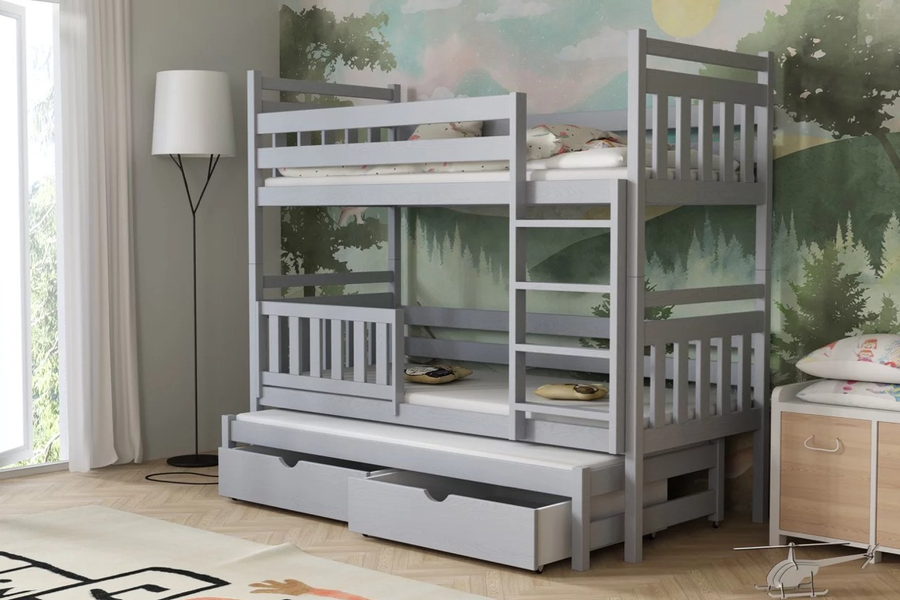 Dětská patrová postel z masivu borovice PETR s přistýlkou a šuplíky - 200x90 cm - ŠEDÁ