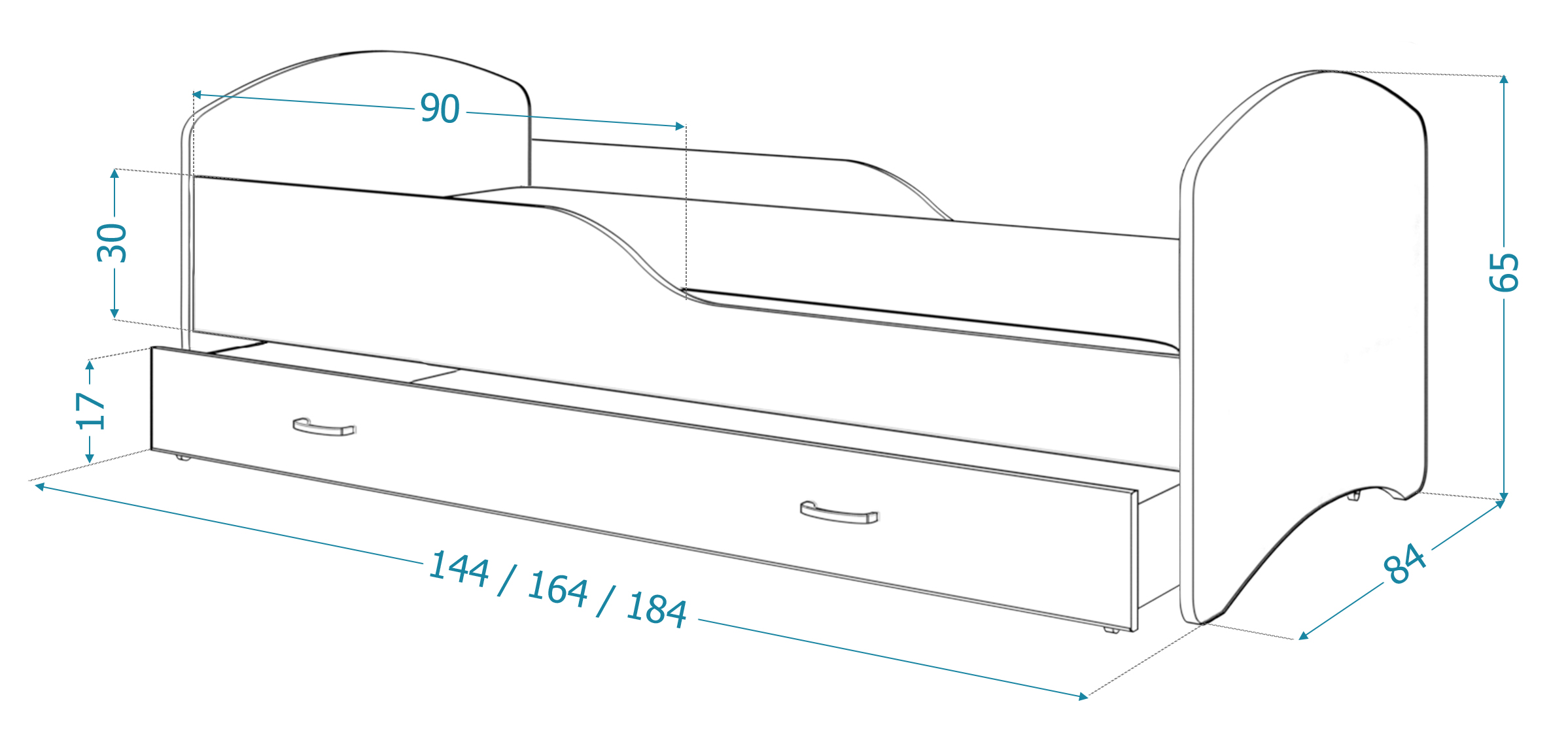 Tato dětská postel je vytvořena tak, aby ušetřila prostor v dětském pokoji. Disponuje jedním lůžkem a šuplíkem na vodících lištách, což umožní jednoduché a bezproblémové zasunutí šuplíku pod postel. Konstrukce postele je uzpůsobena tak, aby zabránila pádu dítěte, a to díky ochranným bariérám. Vaše dítě se tak bude cítit v klidu a bezpečí. Ochranné bariéry, které jsou v ceně postele, lze namontovat z pravé či levé strany, nebo je možné bariéry z postele zcela odejmout. Dětská postel zaujme svým krásným vzhledem a vytváří tak komplexní prvek, který se bude vyjímat v dětském pokoji.