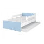 Jednoduchý a klasický vzhled postele je tou správnou volbou na dlouhá léta. Snížená čela jsou kromě moderního designu především funkční, což je dobré řešení i pro malé místnosti. Díky tomu může dítě do postýlky volně nastupovat a vystupovat z ní. Postel je vyrobená z kvalitních lamino desek o síle 16 mm v bílé barvě v kombinaci s jemným modrým odstínem. Lamelový rošt postele vyrobený z borovicového dřeva se vyznačuje svou pevností a díky tomu má postel nosnost 100 kg. Postel lze zakoupit s ochrannými bariérkami a prostorným šuplíkem, který pojme lůžkoviny, oblečení, hračky či jiné nezbytnosti a pomůže tak udržovat pořádek v dětském pokoji.