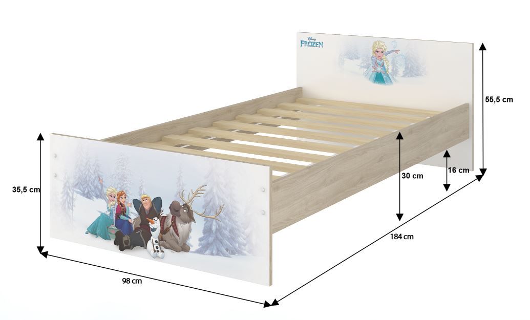Klasický a jednoduchý design za bezkonkurenční ceny. Tato oblíbená dětská postel Disney je vyrobena z kvalitního lamina o tloušťce 18 mm v bílém barevném provedení. Obrázek na čele postele ma hezké syté barvy, které jsou zajištěny speciální ochranou proti oděru. Rošt postele je vyroben z kvalitního borovicového dřeva, díky které má postel nosnost 100 kg.