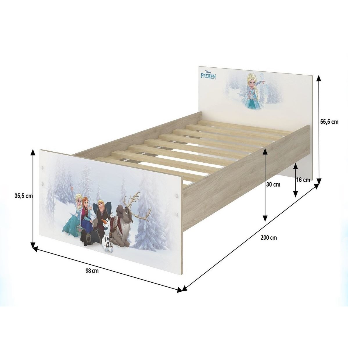 Tato postel s jednoduchým a klasickým designem, zdobená oblíbenými postavičkami Na! Na! Na! Surprise se stane stylovým doplňkem každého dívčího pokoje. Je vyrobena z kvalitních lamino desek o tloušťce 16 mm v elegantní bílé barvě. Obrázek na čele postele má živé syté barvy, které jsou chráněny speciální ochranou proti oděru. Snížené čelo postele nejen přispívá k modernímu designu, ale také je funkční volbou pro prostorově omezené místnosti. Díky němu může dítě volně vstupovat a vystupovat z postele. Rošt postele je vyroben z kvalitního borovicového dřeva a zaručuje nosnost až 100 kg.