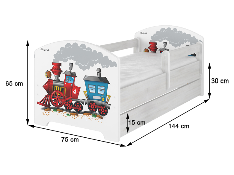 K vytvoření dětské postele OSKAR byly použity vysoce kvalitní MDF desek o tloušťce 16 mm. Postel nadchne klasickým čistým zakulaceným vzhledem s použitím dětských zábran na obou stranách postele, které zajistí bezpečí pro vaše dítě. Motiv na dětské posteli je vyhotoven z ekologických a nezávadných barev, které neohrožují zdraví dítěte. Pevnost a stabilita dětské postele je dána rámem, který je vyrobený z borovicového dřeva. Postel je dodávána včetně šuplíku a bariérek - 1x dlouhá a 1x krátká.