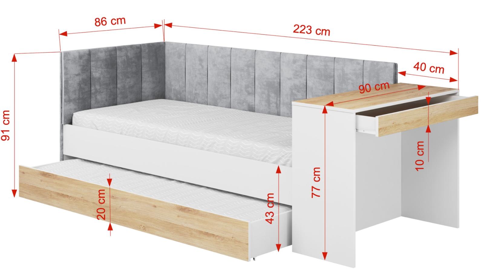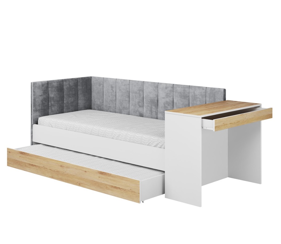 Nízká postel FREYA s funkcí výsuvné přistýlky je promyšleným a mimořádně funkčním řešením pro dětský nebo teenagerský pokoj. Spodní přistýlka, která se vysouvá zpod horní postele, snadno vytvoří dva plně funkční prostory na spaní, aniž by během dne zabírala další místo – ideální pro sourozence nebo hosty na přespání. Hlavní konstrukce je vyrobena z bílé nábytkové desky, která celé konstrukci dodává lehký, všestranný vzhled a perfektně se hodí do různých interiérových designů. Doplňkové prvky v dekoru dubu sonoma vytváří příjemnou kombinaci. Unikátním prvkem tohoto modelu je čalouněné čelo a boční panely ve světle šedé barvě, díky nimž je postel mimořádně útulná a pohodlná. Měkké čalounění chrání před chladem stěny, zvyšuje pohodlí během odpočinku a dodává nábytku moderní a příjemný charakter. Integrovaný psací stůl vytváří praktický studijní a pracovní prostor, který dokonale vyhovuje potřebám dětí školního věku. Je to pohodlné místo pro domácí úkoly, kreslení nebo práci s počítačem, které podporuje soustředění a dobrou organizaci každodenních úkolů. Postel je dodávána včetně roštů, které zajišťují stabilitu a správnou oporu matrace, čímž se zajistí pohodlný a zdravý spánek. Orientaci postele lze zvolit na pravou nebo levou stranu.