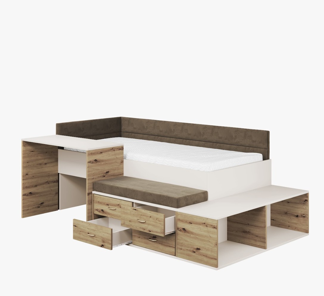 Hlavní konstrukce postele AMIRA je vyrobena z nábytkové desky v kašmírové barvě, což zajišťuje univerzální a esteticky příjemný vzhled, který doplní každý dětský nebo teenagerský pokoj. Barva doplňků v dekoru dubu artisan tvoří příjemnou a neotřelou kombinaci, která se hodí do různých druhů moderních interiérů. Praktické zásuvky a funkční psací stůl činí z postele perfektní volbu pro potřeby dětí školního věku. Zásuvky jsou ideální pro uložení sešitů, knih a školních potřeb a pomáhají udržovat pořádek, zatímco psací stůl vytváří pohodlné místo pro studium, domácí úkoly a koníčky. Toto řešení podporuje samostatnost dítěte a usnadňuje každodenní organizaci. Další výhodou je pohodlný čalouněný sedák a boční panely v hnědé barvě. To dodává nábytku nejen funkčnost, ale i útulný pocit. Měkké čalounění chrání před chladem stěny a zvyšuje pohodlí během odpočinku. Součástí sady je také rám z pevných lamel, který poskytuje dostatečnou oporu matrace, strukturální stabilitu a pohodlný spánek.