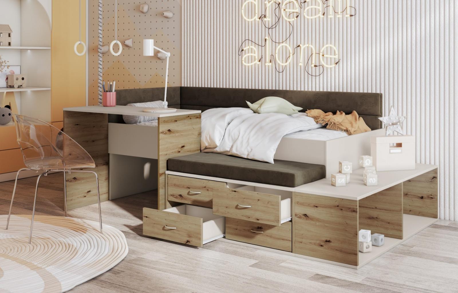 Dětská postel s psacím stolem a úložnými prostory AMIRA - 180x80 cm - kašmírová/hnědá/dub artisan
