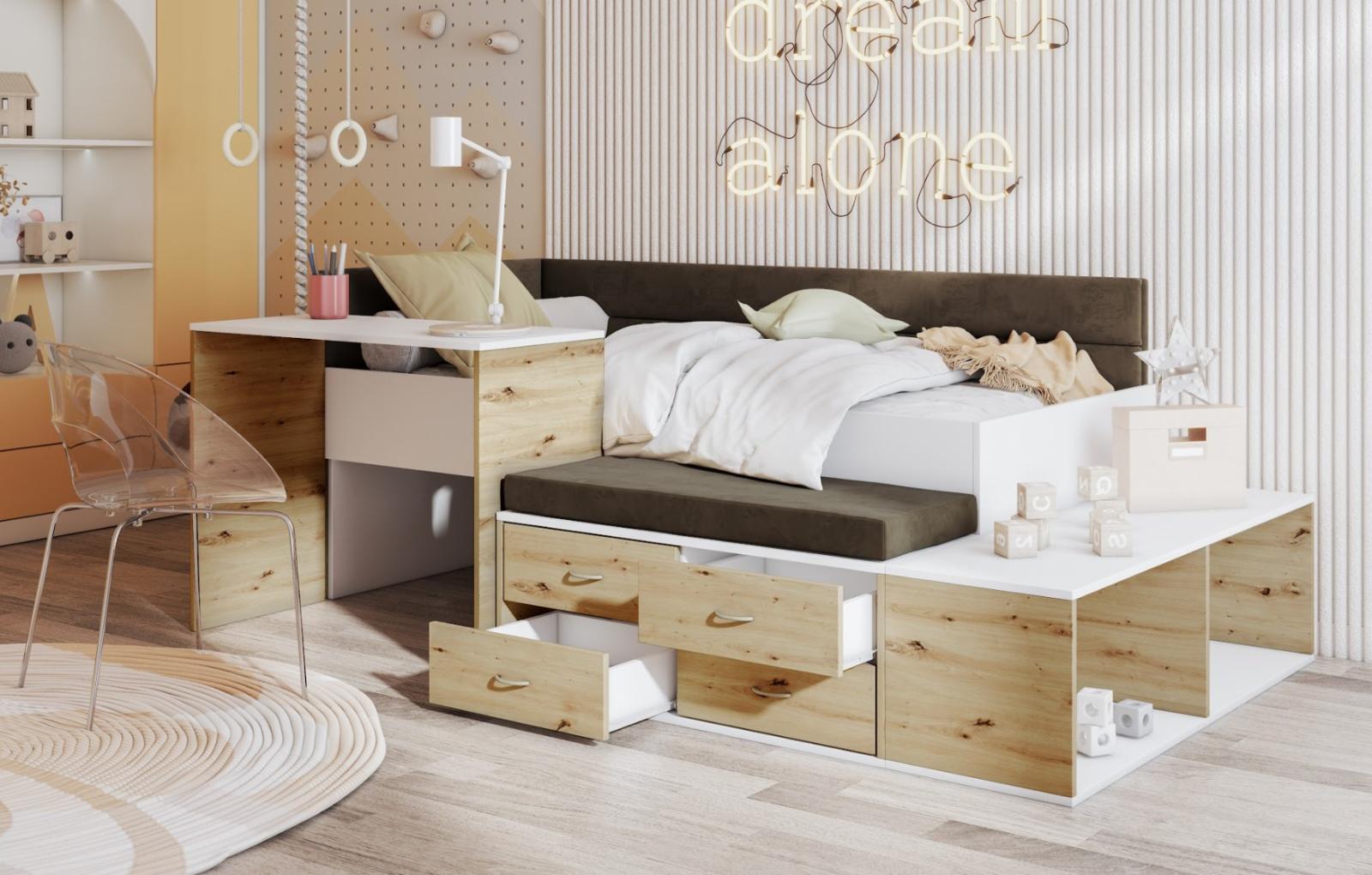 Hlavní konstrukce postele AMIRA je vyrobena z nábytkové desky v bílé barvě, což zajišťuje univerzální a esteticky příjemný vzhled, který doplní každý dětský nebo teenagerský pokoj. Barva doplňků v dekoru dubu artisan tvoří příjemnou a neotřelou kombinaci, která se hodí do různých druhů moderních interiérů. Praktické zásuvky a funkční psací stůl činí z postele perfektní volbu pro potřeby dětí školního věku. Zásuvky jsou ideální pro uložení sešitů, knih a školních potřeb a pomáhají udržovat pořádek, zatímco psací stůl vytváří pohodlné místo pro studium, domácí úkoly a koníčky. Toto řešení podporuje samostatnost dítěte a usnadňuje každodenní organizaci. Další výhodou je pohodlný čalouněný sedák a boční panely v hnědé barvě. To dodává nábytku nejen funkčnost, ale i útulný pocit. Měkké čalounění chrání před chladem stěny a zvyšuje pohodlí během odpočinku. Součástí sady je také rám z pevných lamel, který poskytuje dostatečnou oporu matrace, strukturální stabilitu a pohodlný spánek.