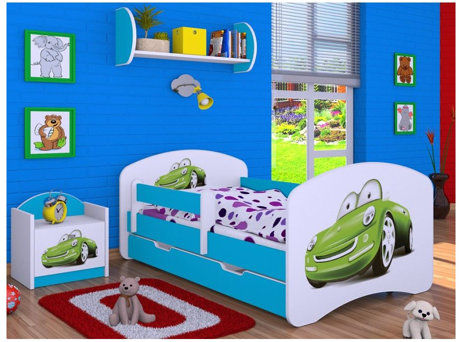 Dětská postel se šuplíkem 180x90cm ZELENÉ AUTO - modrá