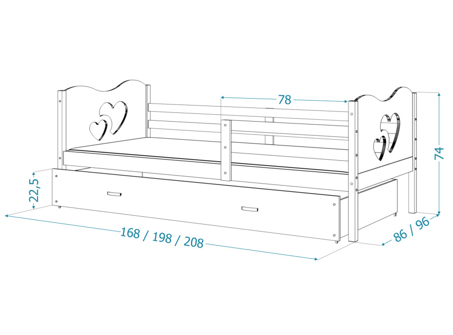 Tato dětská postel je vytvořena tak, aby ušetřila prostor v dětském pokoji. Disponuje jedním lůžkem a šuplíkem na kolečkách, což umožní snadné zasunutí šuplíku pod postel. Konstrukce postele je uzpůsobena tak, aby zabránila pádu dítěte, a to díky ochranným bariérám. Vaše dítě se tak bude cítit v klidu a bezpečí. Dětská postel zaujme vzory po stranách a vytváří tak komplexní prvek, který se bude vyjímat v dětském pokoji.