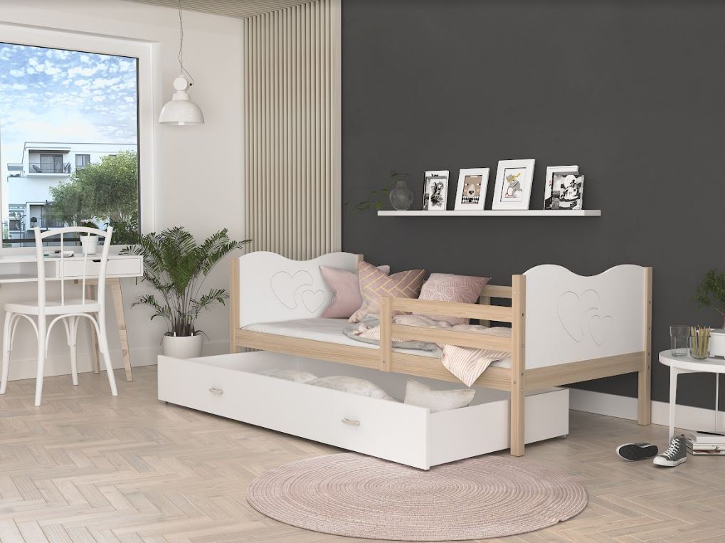 Dětská postel se šuplíkem MAX S - 200x90 cm - bílá/borovice - srdíčka