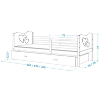 Tato dětská postel je vytvořena tak, aby ušetřila prostor v dětském pokoji. Disponuje jedním lůžkem a šuplíkem na kolečkách, což umožní snadné zasunutí šuplíku pod postel. Konstrukce postele je uzpůsobena tak, aby zabránila pádu dítěte, a to díky ochranným bariérám. Vaše dítě se tak bude cítit v klidu a bezpečí. Dětská postel zaujme vyřezanými vzory po stranách a vytváří tak komplexní prvek, který se bude vyjímat v dětském pokoji.