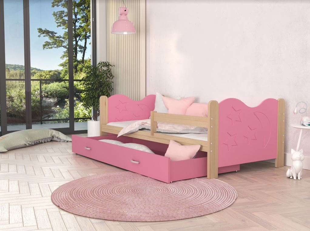 Dětská postel se šuplíkem MIKOLÁŠ - 190x80 cm - růžová/borovice - měsíc a hvězdičky