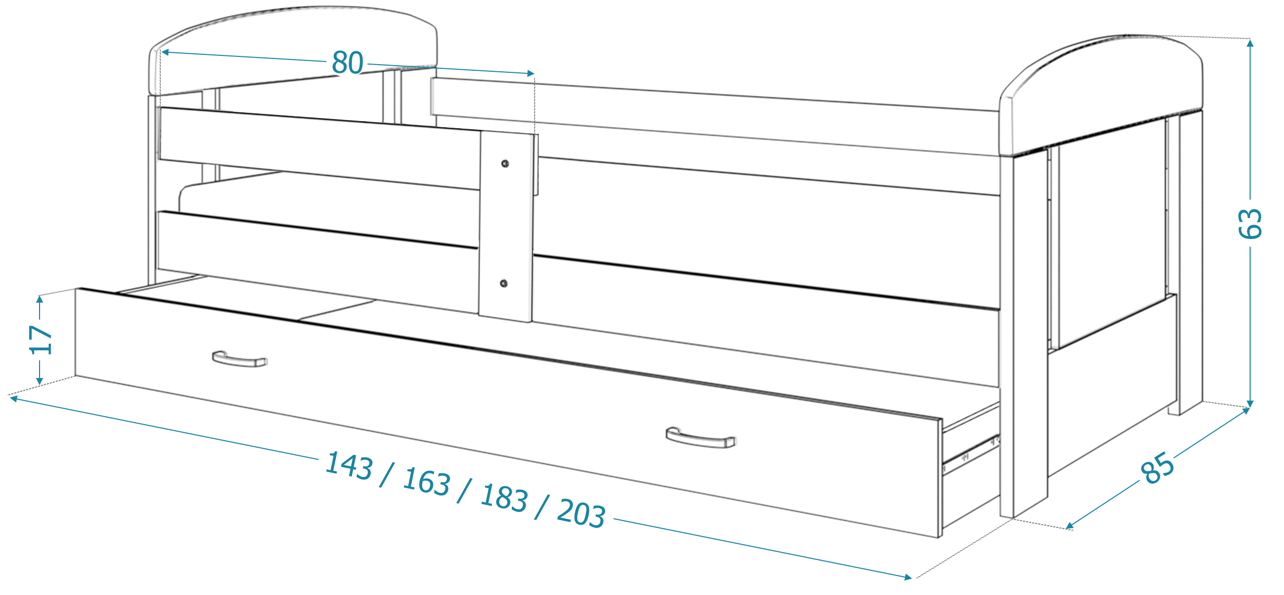 Rozměry postele: 143x85x63 cm, ložná plocha pro matraci 140x80 cm.