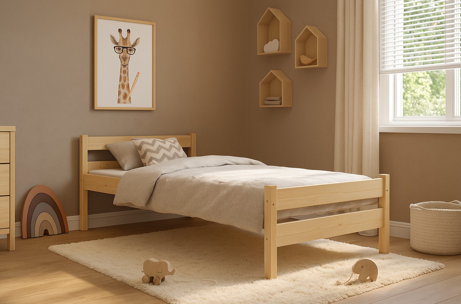 Dětská postel ALEXANDR se vyznačuje jednoduchým designem a konstrukcí, které se budou hodit do moderních skandinávských i klasických interiérů. Postel je vyrobena z masivního borovicového dřeva bez povrchových úprav, což nabízí přirozený vzhled. Postel je ekologická, odolná a lze ji snadno přizpůsobit - její vzhled můžete upravit mořením, lakováním nebo malováním dle vlastního uvážení. Přírodní, neupravený povrch umožňuje nábytku dýchat a je také ideální do dětských pokojů a pokojů pro alergiky. Postel kombinuje funkčnost, odolnost a estetiku a vytváří příjemný prostor pro spánek a odpočinek. Součástí postele je také pevný a odolný flex rošt vyrobený z březových lamel.