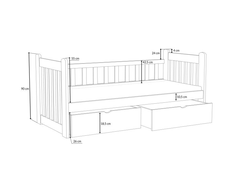 Dětská postel ARTUR je je klasická dřevěná postel, ideální do dětského pokoje i pokoje pro mládež. Postel je odolná, což znamená, že ji lze bez problémů používat po mnoho let. Díky vysokým opěrkám a bočnici má postel velmi univerzální využití - díky svému specifickému designu může sloužit jak jako pohodlné místo na spaní, tak i jako pohovka. Konstrukce postele Artur z masivního borovicového dřeva je mimořádně pevná. U bočnic a čel je šířka použitého materiálu 2,6 cm. Přírodní materiály zajistí zdravý a klidný spánek vašeho dítěte. Součástí postele jsou dva prostorné šuplíky, které slouží k uložení lůžkovin a hraček a pevný laťkový rošt. To vše dělá z postele Artur výbornou volbu nejen pro mladší, ale i o něco starší děti, pro které je postel zároveň místem pro hraní, učení i odpočinek. Postel je pokryta ekologickým lakem bez zápachu, který nezpůsobuje alergické reakce ani jiné zdravotní problémy.