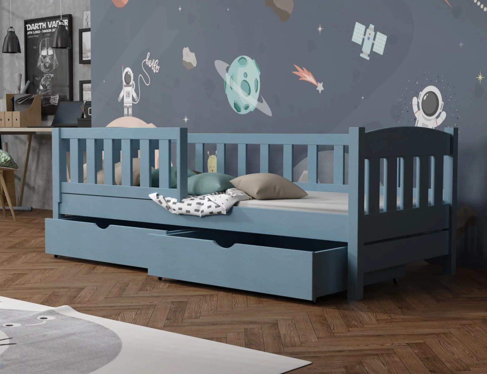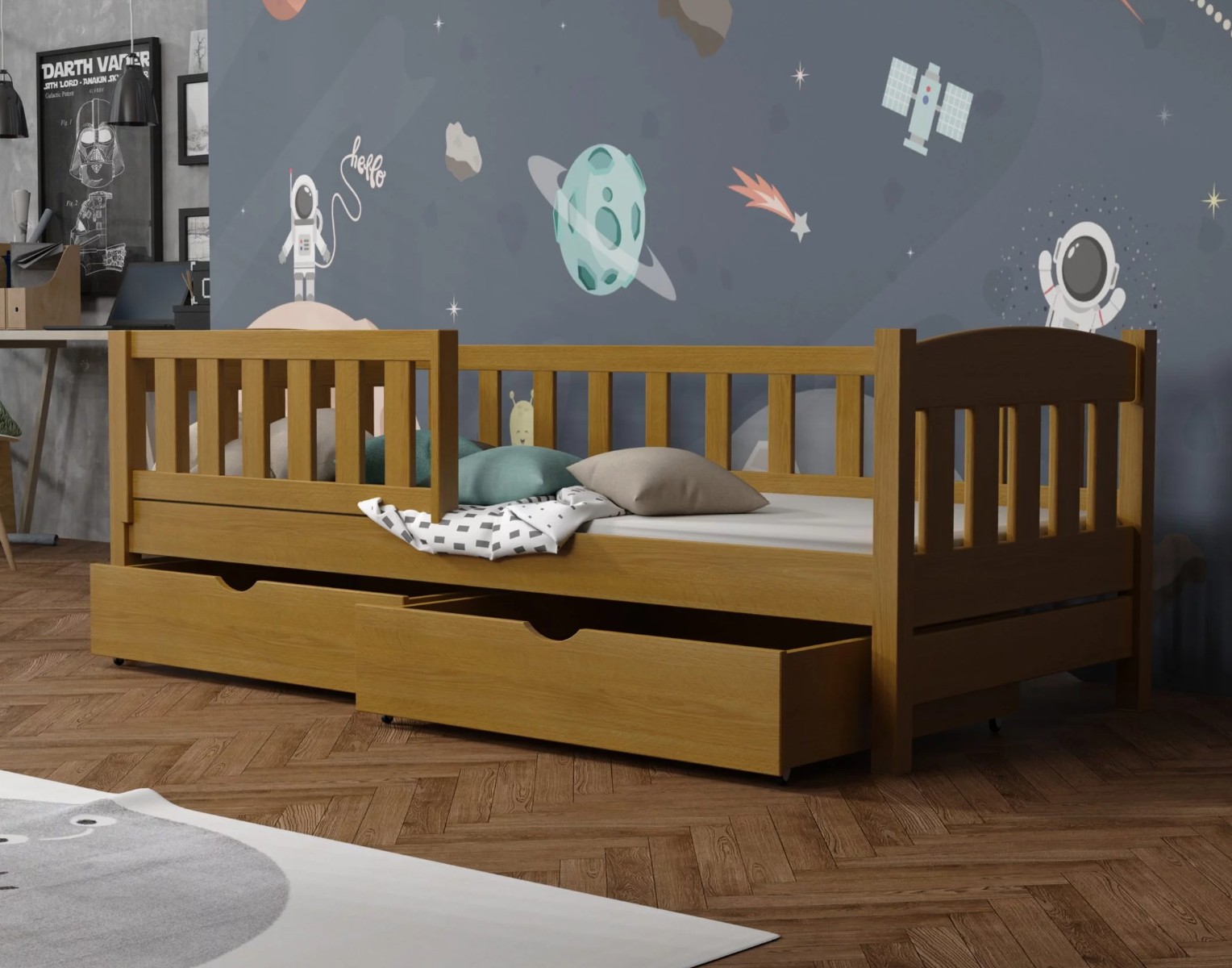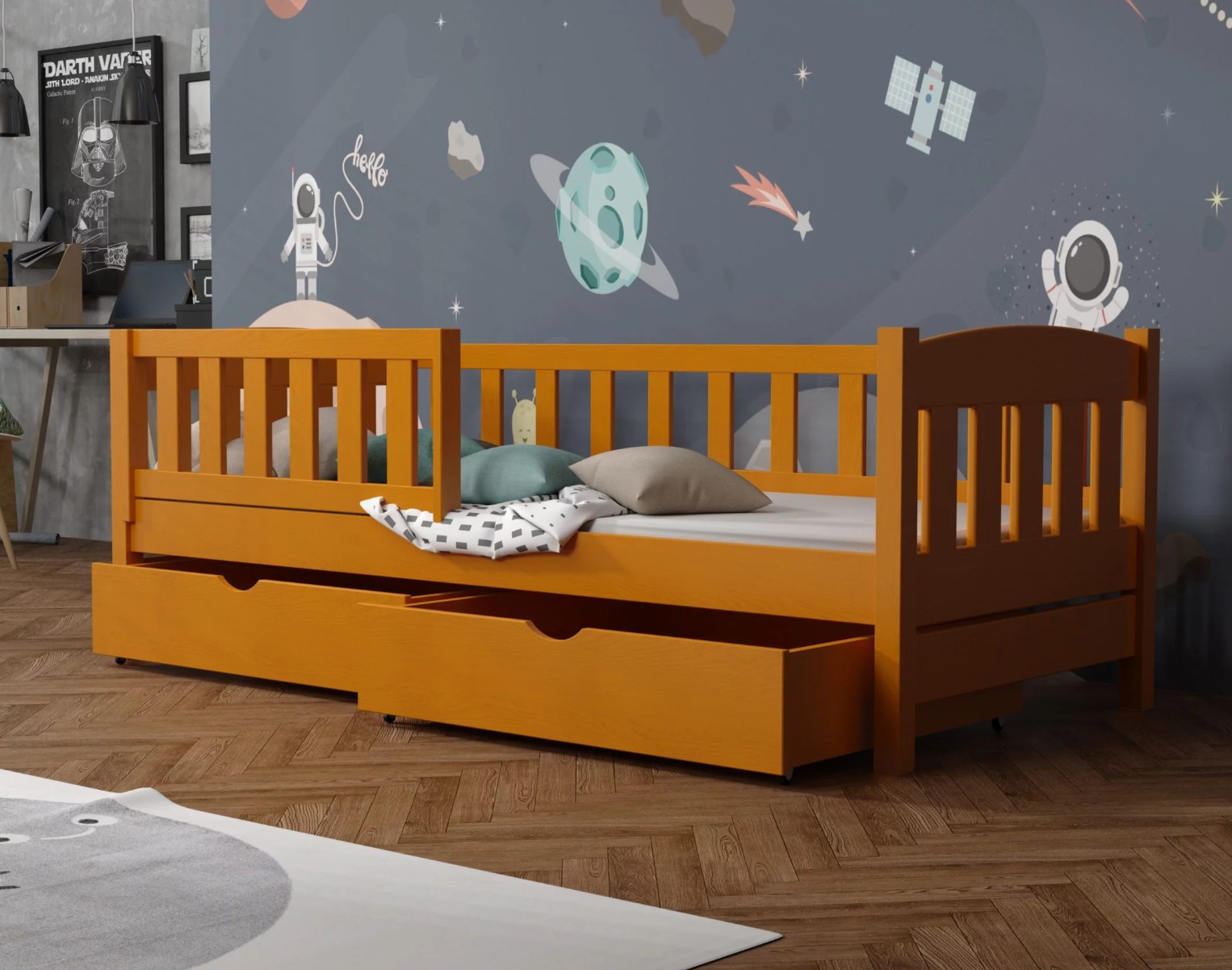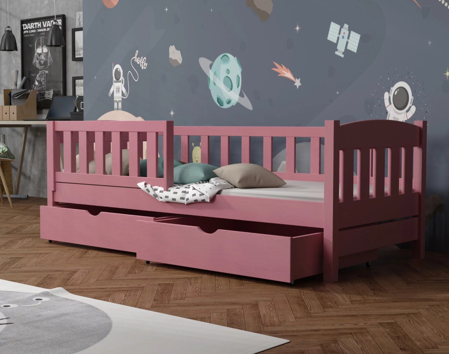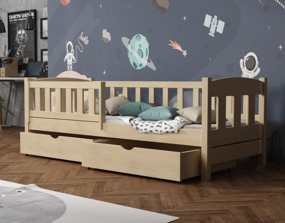 Postel BEN se díky minimalistickému designu hodí do každého interiéru. Tento model není jen místem pro noční odpočinek, ale také pro zábavu! Jednolůžková postel BEN je vyrobena z masivního borovicového dřeva, díky čemuž je mimořádně pevná a odolná proti poškození. U bočnic a čel je šířka použitého materiálu 2,6 cm. Bezpečnostní zábrana zajistí vašemu dítěti bezpečný spánek po celou noc a zabrání možnosti vypadnutí. Tento prvek lze odstranit, když dítě povyroste a již jej nepotřebuje. Postel nabízíme v několika barevných variantách, případně bez povrchových úprav. Surové dřevo nabízí přirozený vzhled. Postel je ekologická, odolná a lze ji snadno přizpůsobit - její vzhled můžete upravit mořením, lakováním nebo malováním dle vlastního uvážení. Barevné varianty jsou ošetřeny ekologickým lakem bez zápachu, který zvyšuje odolnost postele proti poškrábání. Postel dodáváme se dvěma prostornými šuplíky, které slouží k ukládání lůžkovin a pomohou udržet pořádek v dětském pokoji. Součástí postele je také kvalitní rošt.
