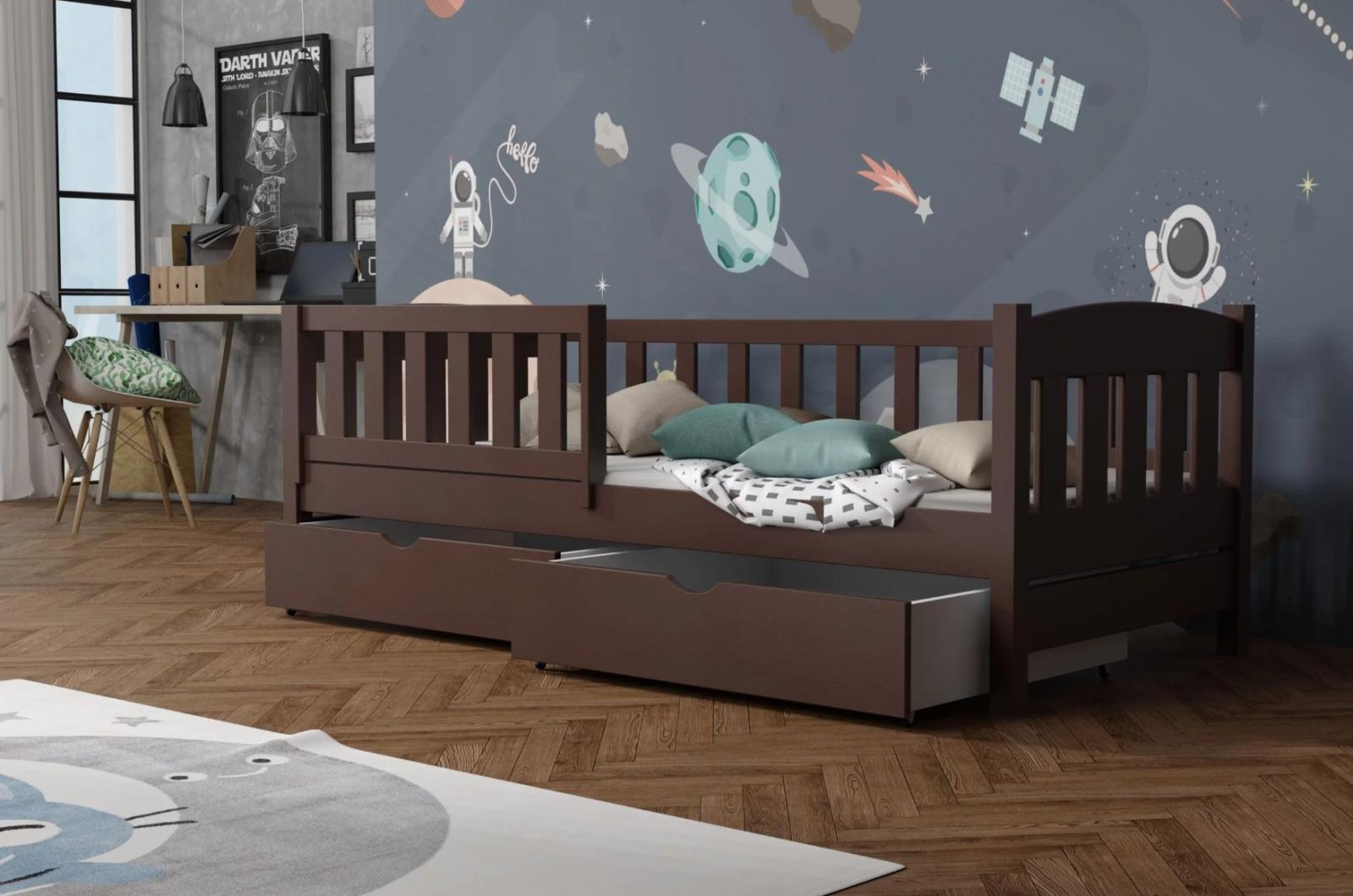 Postel BEN se díky minimalistickému designu hodí do každého interiéru. Tento model není jen místem pro noční odpočinek, ale také pro zábavu! Jednolůžková postel BEN je vyrobena z masivního borovicového dřeva, díky čemuž je mimořádně pevná a odolná proti poškození. U bočnic a čel je šířka použitého materiálu 2,6 cm. Bezpečnostní zábrana zajistí vašemu dítěti bezpečný spánek po celou noc a zabrání možnosti vypadnutí. Tento prvek lze odstranit, když dítě povyroste a již jej nepotřebuje. Postel nabízíme v několika barevných variantách, případně bez povrchových úprav. Surové dřevo nabízí přirozený vzhled. Postel je ekologická, odolná a lze ji snadno přizpůsobit - její vzhled můžete upravit mořením, lakováním nebo malováním dle vlastního uvážení. Barevné varianty jsou ošetřeny ekologickým lakem bez zápachu, který zvyšuje odolnost postele proti poškrábání. Postel dodáváme se dvěma prostornými šuplíky, které slouží k ukládání lůžkovin a pomohou udržet pořádek v dětském pokoji. Součástí postele je také kvalitní rošt.