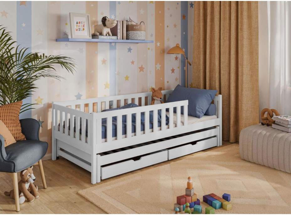 Dětská postel z masivu borovice CALI patří mezi dětské postele, které se vyznačují jednoduchým designem. Postel je pečlivě vyrobená, má pevnou konstrukci a je propracována do posledního detailu. Borovicové dřevo, které se k její výrobě používá, je té nejvyšší kvality. Postel je odolná proti poškrábání a to díky třem vrstvám ekologického laku s certifikací EN 71-3 : 2013. Lak je bez zápachu a vyznačuje se vynikající světlostálostí. Konstrukce postele je uzpůsobena tak, aby zabránila pádu dítěte, a to díky ochranným bariérám. Součástí postele je pevná ochranná bariéra, díky které je postel vhodná i pro nejmenší děti. Vaše dítě se tak bude cítit v klidu a bezpečí. Další předností postele je výsuvná přistýlka, která poskytne místo pro odpočinek a spánek sourozenci nebo kamarádovi. Postel je dodávána včetně dvou menších šuplíků na kolečkách, do kterých můžete ukládat lůžkoviny nebo hračky. Čelo šuplíku i bočnice jsou vyrobeny z lamino desek s PVC úpravou. Dětská postel zaujme svým krásným vzhledem a vytváří tak komplexní prvek, který se bude vyjímat v každém dětském pokoji.