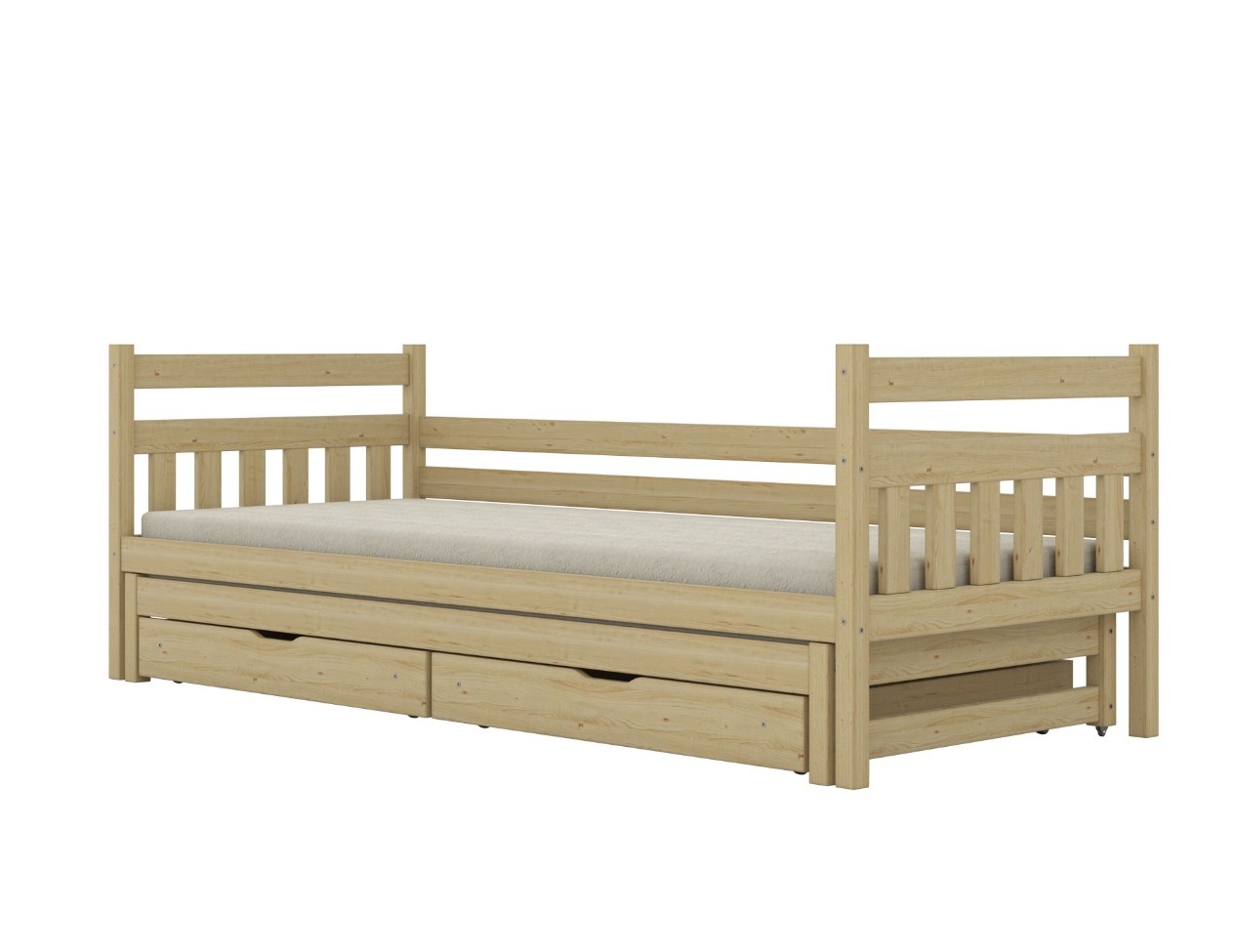Dětská postel DAMIÁN v sobě spojuje bezpečnost, pohodlí a funkčnost. Díky svému jednoduchému a nadčasovému designu je perfektním doplňkem do nejrůznějších interiérů – od dětského pokoje až po moderní prostor pro mládež. Její pevná konstrukce z přírodního borovicového dřeva zajišťuje dlouhou životnost a další úložné prostory vám umožní udržet si pokoj v pořádku – což ocení jak rodiče, tak teenageři. Postel je vyrobena z masivního borovicového dřeva a je ošetřena ekologickým lakem na vodní bázi, který zvyšuje odolnost postele vůči poškození a poškrábání. Součástí postele je také pevný a odolný flex rošt vyrobený z březových lamel.