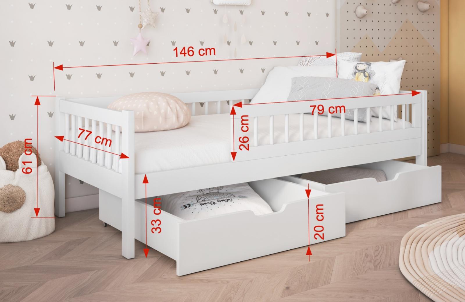 Dětská postel z masivu borovice FLORES je elegantní jednolůžko, které dokonale kombinuje funkčnost s moderním designem. Postel se vyznačuje svou praktičností a atraktivním designem, který skvěle zapadne do každého dětského pokoje. Postel je vyrobena z velice kvalitního borovicového dřeva, které je ošetřeno třemi vrstvami ekologického laku. Tím je zajištěna vysoká odolnost postele vůči mechanickému poškození a různým druhům nečistot. Bezpečnost dětí zajišťují vysoké bočnice a ochranná bariéra, která zabrání nechtěným pádům dítěte během spánku. Postel je dodávána se dvěma prostornými šuplíky na kolečkách, kam si můžete uložit lůžkoviny, hračky nebo jiné nezbytnosti.