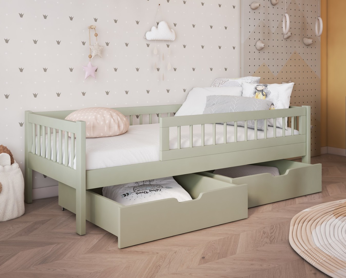 Dětská postel z masivu borovice FLORES se šuplíky - 140x70 cm - olivově zelená