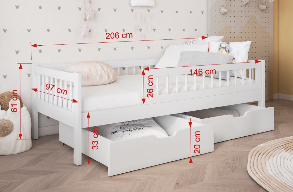 Dětská postel z masivu borovice FLORES je elegantní jednolůžko, které dokonale kombinuje funkčnost s moderním designem. Postel se vyznačuje svou praktičností a atraktivním designem, který skvěle zapadne do každého dětského pokoje. Postel je vyrobena z velice kvalitního borovicového dřeva, které je ošetřeno třemi vrstvami ekologického laku. Tím je zajištěna vysoká odolnost postele vůči mechanickému poškození a různým druhům nečistot. Bezpečnost dětí zajišťují vysoké bočnice a ochranná bariéra, která zabrání nechtěným pádům dítěte během spánku. Postel je dodávána se dvěma prostornými šuplíky na kolečkách, kam si můžete uložit lůžkoviny, hračky nebo jiné nezbytnosti.