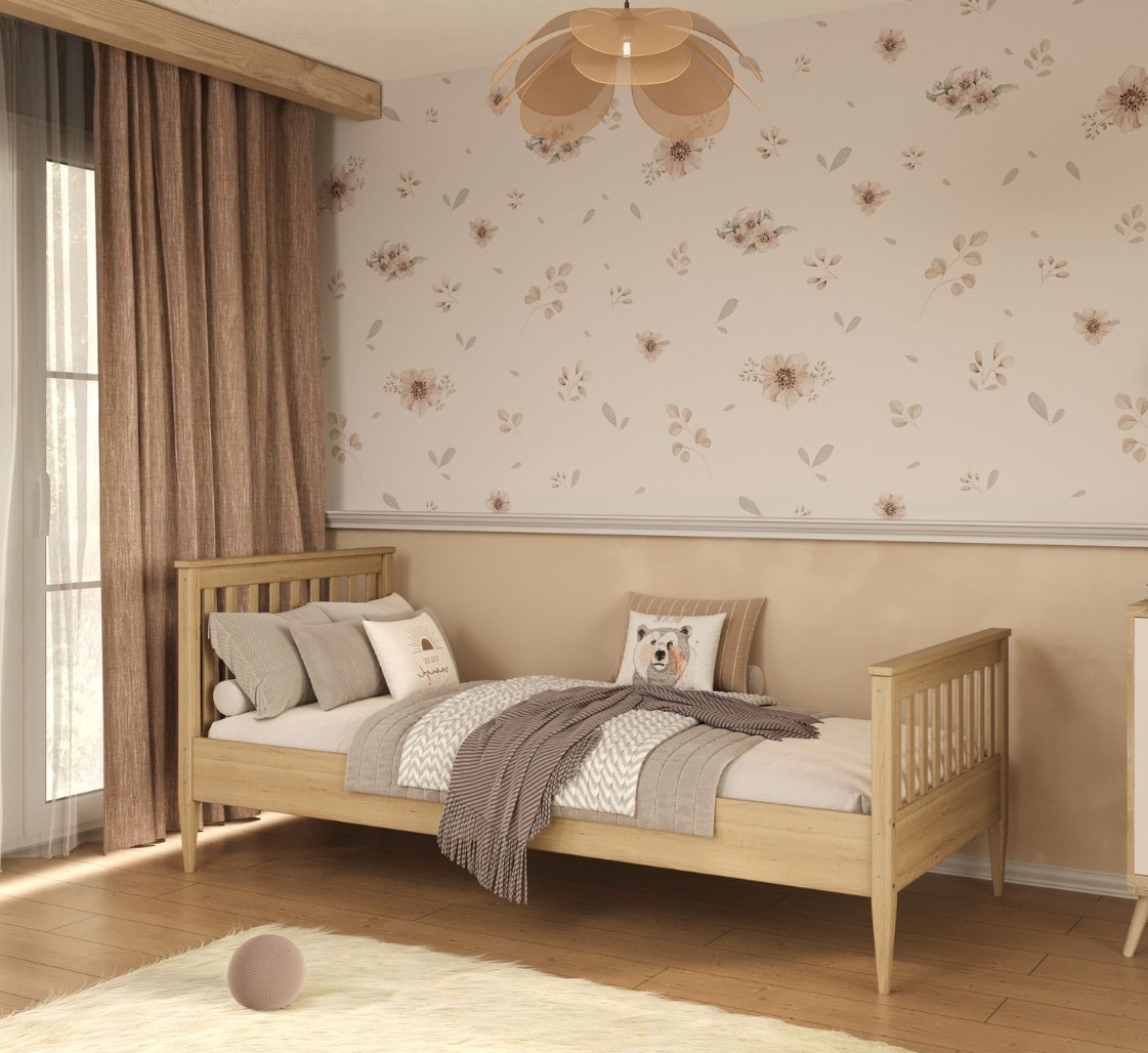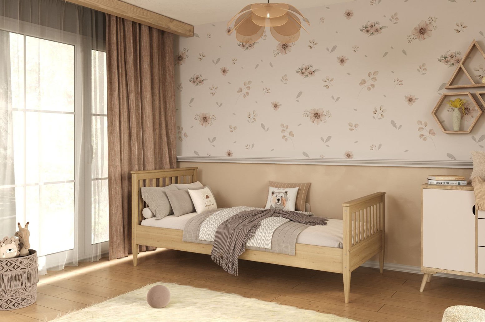 Dětská postel IGNÁC je kombinací elegance, bezpečnosti a jednoduchého designu. Štíhlé linie a klasická žebrovaná čela dodávají nábytku lehkost a styl. Postel je vyrobena z masivního borovicového dřeva bez povrchových úprav, což nabízí přirozený vzhled. Postel je ekologická, odolná a lze ji snadno přizpůsobit - její vzhled můžete upravit mořením, lakováním nebo malováním dle vlastního uvážení. Přírodní, neupravený povrch umožňuje nábytku dýchat a je také ideální do dětských pokojů a pokojů pro alergiky. Postel kombinuje funkčnost, odolnost a estetiku a vytváří příjemný prostor pro spánek a odpočinek. Součástí postele je také pevný a odolný flex rošt vyrobený z březových lamel. Skvěle se hodí jak do dětského pokoje, tak i do pokoje pro dospívající.