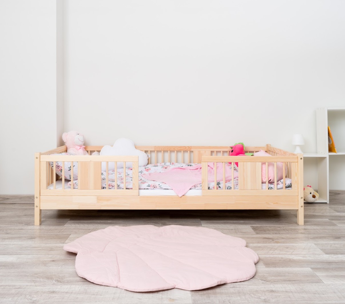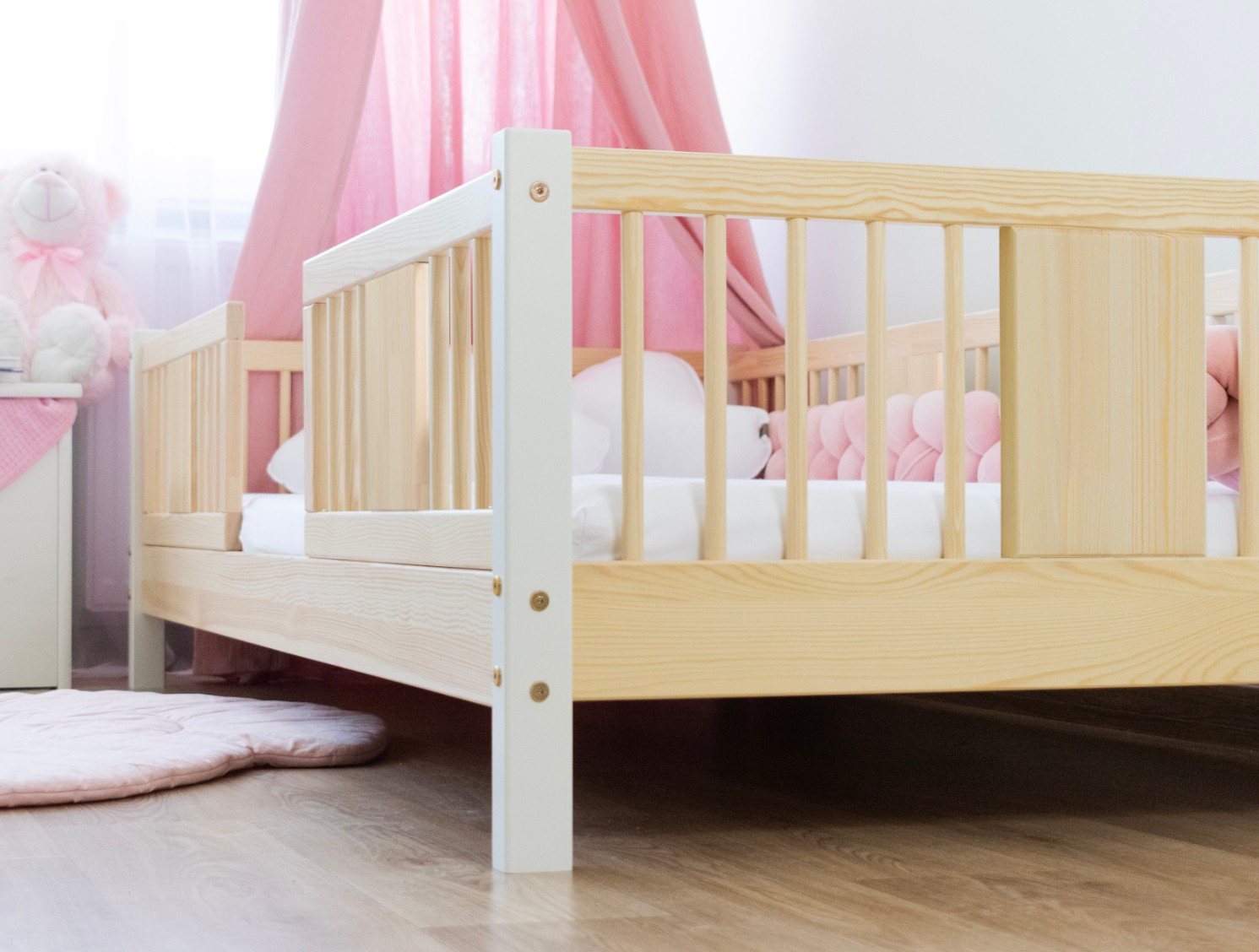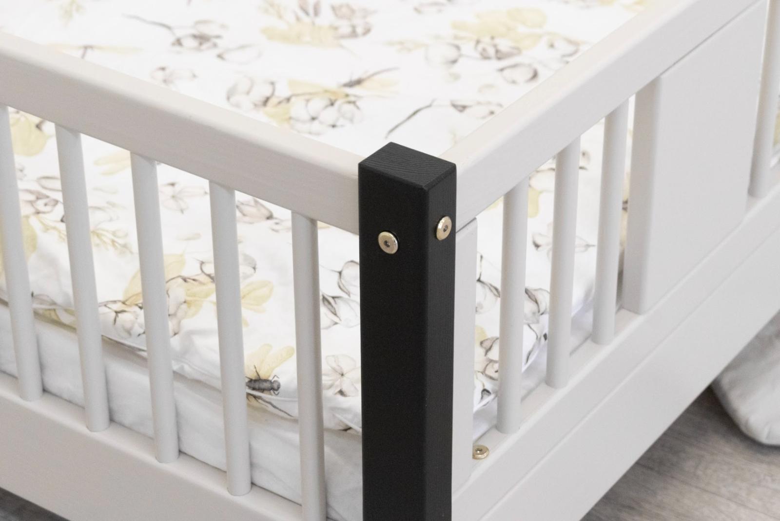 LUNA 10 cm je dřevěná dětská postel s 10 cm zvýšeným roštem, která kombinuje funkčnost, estetiku a bezpečnost. Její decentní tvar se zaoblenými lamelami a přírodními materiály z ní činí ideální volbu pro skandinávský styl a pokoje inspirované Montessori. Je to perfektní volba pro rodiče, kteří hledají první postel pro dítě, která zajistí pohodlný spánek a krásný interiér. Postel LUNA 10 je vyrobena výhradně z přírodního borovicového dřeva, známého pro svou odolnost a hřejivý, příjemný vzhled. Všechny prvky jsou hladce broušené a zaoblené, což zajišťuje naprostou bezpečnost i pro nejmenší děti. Povrchová úprava je provedena ekologickými barvami na vodní bázi, které splňují evropskou normu EN 71-3 – bez zápachu, toxinů a škodlivých látek. Díky tomu je postel LUNA 10 ideální do pokojů alergiků nebo kojenců. Postel nabízíme také ve verzi bez povrchových úprav - nelakované dřevo. Díky tomu ji lze snadno přizpůsobit - její vzhled můžete upravit mořením, lakováním nebo malováním dle vlastního uvážení. Každý prvek rámu byl precizně vyleštěn a hrany jsou jemně zaoblené, aby bylo zajištěno maximální pohodlí a bezpečnost. Bezpečnostní zábrany u vstupu do postele jsou odnímatelné.