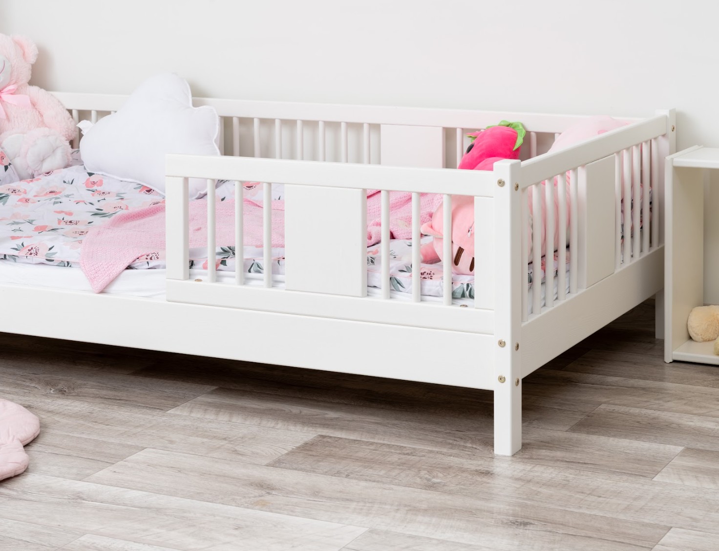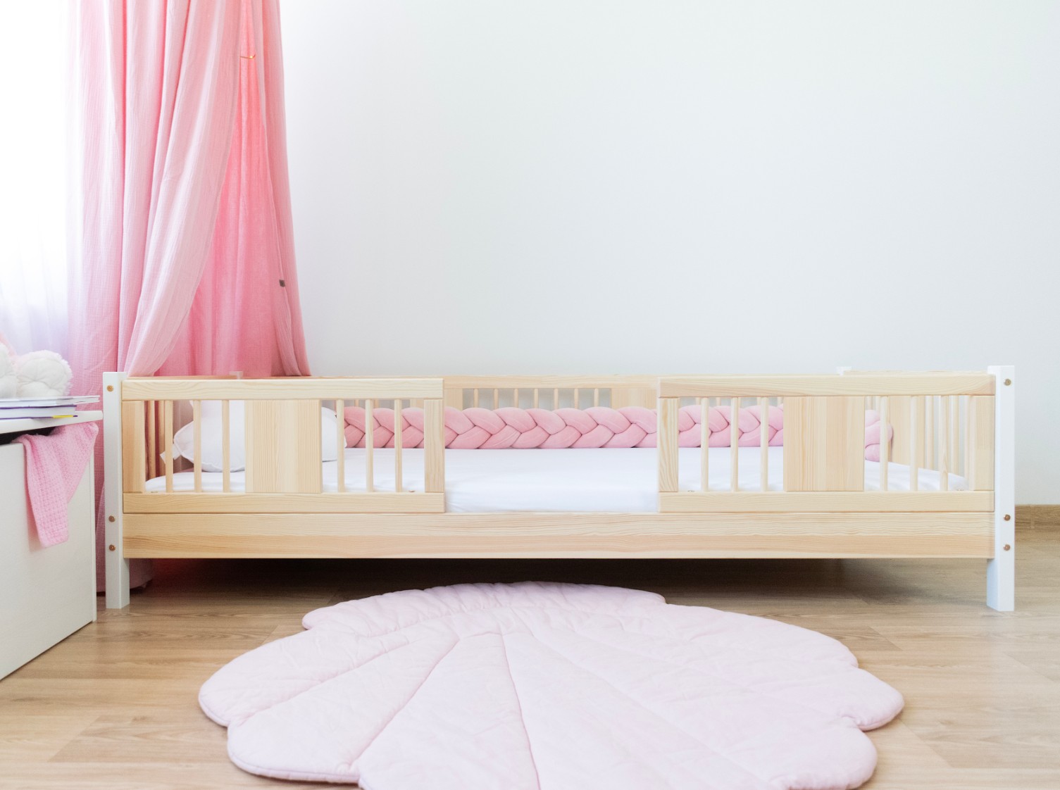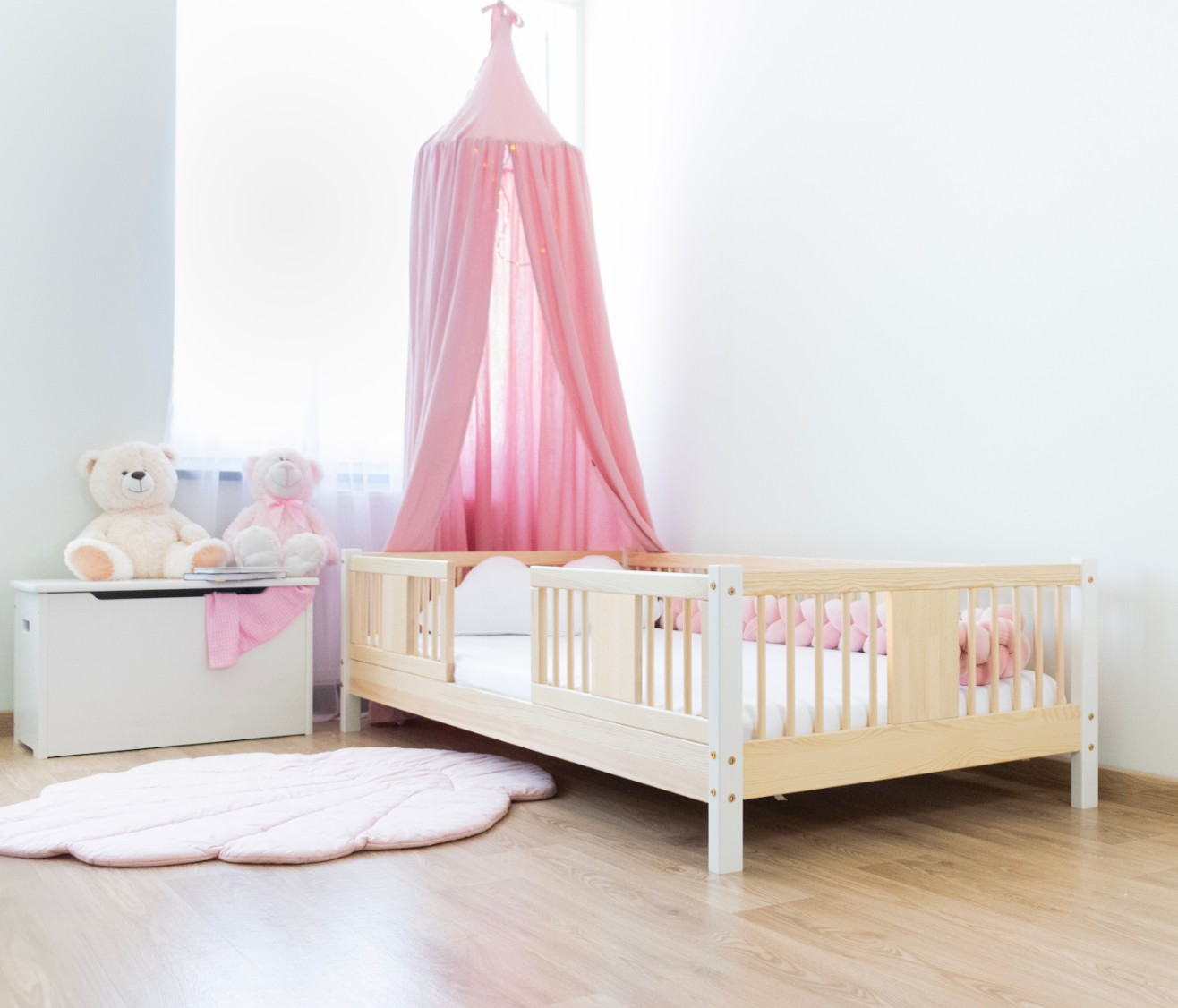 LUNA 10 cm je dřevěná dětská postel s 10 cm zvýšeným roštem, která kombinuje funkčnost, estetiku a bezpečnost. Její decentní tvar se zaoblenými lamelami a přírodními materiály z ní činí ideální volbu pro skandinávský styl a pokoje inspirované Montessori. Je to perfektní volba pro rodiče, kteří hledají první postel pro dítě, která zajistí pohodlný spánek a krásný interiér. Postel LUNA 10 je vyrobena výhradně z přírodního borovicového dřeva, známého pro svou odolnost a hřejivý, příjemný vzhled. Všechny prvky jsou hladce broušené a zaoblené, což zajišťuje naprostou bezpečnost i pro nejmenší děti. Povrchová úprava je provedena ekologickými barvami na vodní bázi, které splňují evropskou normu EN 71-3 – bez zápachu, toxinů a škodlivých látek. Díky tomu je postel LUNA 10 ideální do pokojů alergiků nebo kojenců. Postel nabízíme také ve verzi bez povrchových úprav - nelakované dřevo. Díky tomu ji lze snadno přizpůsobit - její vzhled můžete upravit mořením, lakováním nebo malováním dle vlastního uvážení. Každý prvek rámu byl precizně vyleštěn a hrany jsou jemně zaoblené, aby bylo zajištěno maximální pohodlí a bezpečnost. Bezpečnostní zábrany u vstupu do postele jsou odnímatelné.