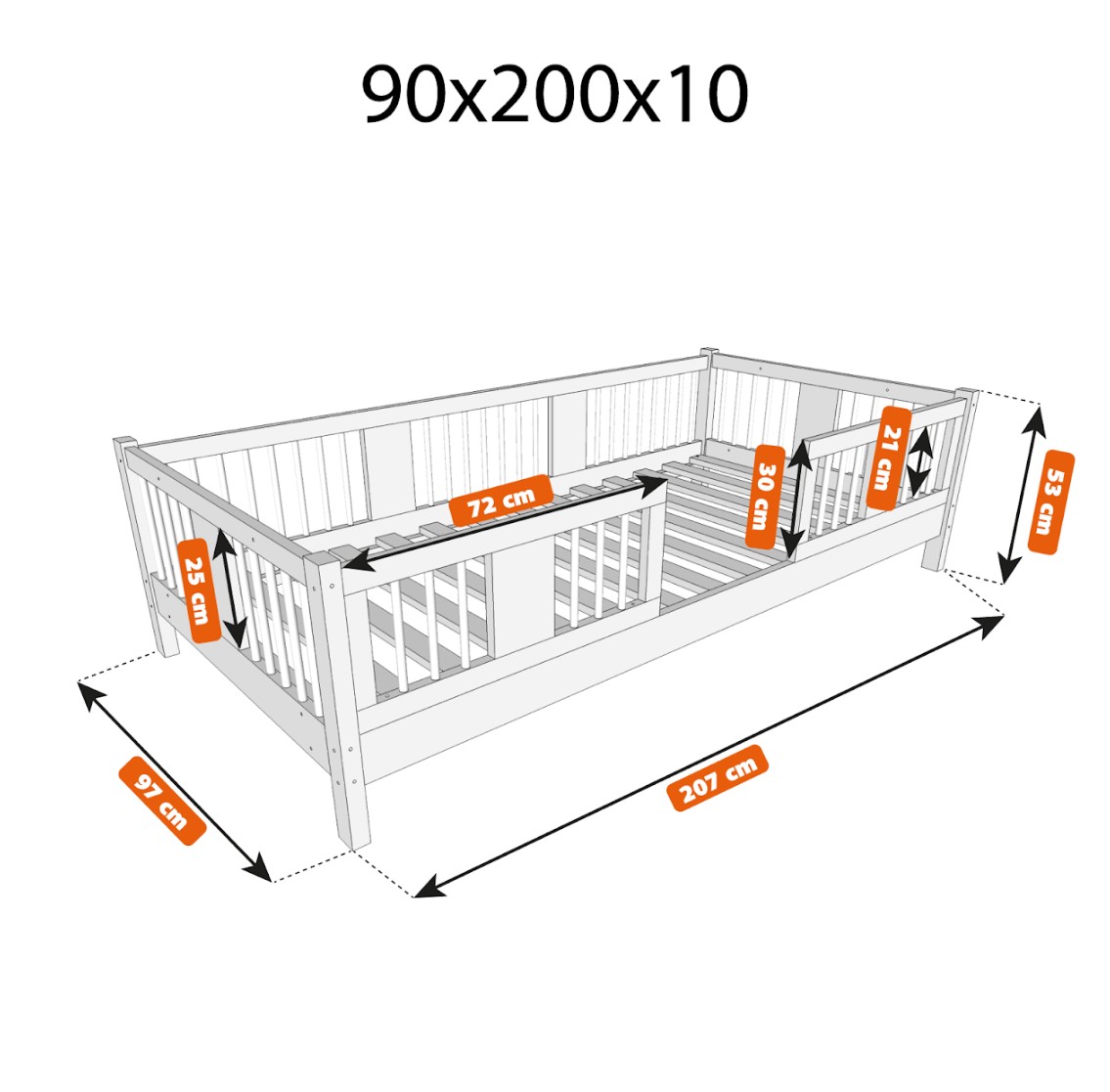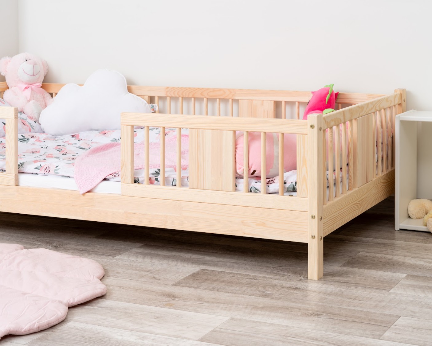 LUNA 10 cm je dřevěná dětská postel s 10 cm zvýšeným roštem, která kombinuje funkčnost, estetiku a bezpečnost. Její decentní tvar se zaoblenými lamelami a přírodními materiály z ní činí ideální volbu pro skandinávský styl a pokoje inspirované Montessori. Je to perfektní volba pro rodiče, kteří hledají první postel pro dítě, která zajistí pohodlný spánek a krásný interiér. Postel LUNA 10 je vyrobena výhradně z přírodního borovicového dřeva, známého pro svou odolnost a hřejivý, příjemný vzhled. Všechny prvky jsou hladce broušené a zaoblené, což zajišťuje naprostou bezpečnost i pro nejmenší děti. Povrchová úprava je provedena ekologickými barvami na vodní bázi, které splňují evropskou normu EN 71-3 – bez zápachu, toxinů a škodlivých látek. Díky tomu je postel LUNA 10 ideální do pokojů alergiků nebo kojenců. Postel nabízíme také ve verzi bez povrchových úprav - nelakované dřevo. Díky tomu ji lze snadno přizpůsobit - její vzhled můžete upravit mořením, lakováním nebo malováním dle vlastního uvážení. Každý prvek rámu byl precizně vyleštěn a hrany jsou jemně zaoblené, aby bylo zajištěno maximální pohodlí a bezpečnost. Bezpečnostní zábrany u vstupu do postele jsou odnímatelné.