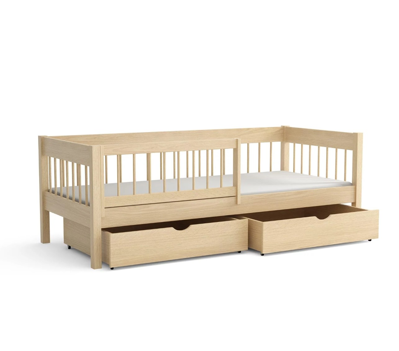 Model LUNARI je moderní interpretací klasické dětské postele – nízká, stabilní a vybavená prostornými zásuvkami, ideálními pro uložení ložního prádla, hraček nebo sezónního oblečení. Je to perfektní řešení pro rodiče, kteří si cení pořádku, funkčnosti a pohodlí, aniž by obětovali esteticky příjemný minimalistický design. Jednolůžko Lunari v sobě spojuje nadčasový styl, solidní řemeslné zpracování a každodenní pohodlí. Její konstrukce z přírodního borovicového dřeva zaručuje trvanlivost a odolnost vůči každodennímu používání a zároveň si zachovává lehký a elegantní vzhled díky kulatým příčkám tvořícím boční zábrany a ochrannou bariérku. U bočnic a čel je šířka použitého materiálu 2,6 cm. Díky svému univerzálnímu designu se Lunari bez problémů hodí do různých stylů interiérů – od moderního a skandinávského až po klasický design. Tato postel se bude dobře hodit jak do pokoje pro batolata, tak do pokoje pro starší děti a nabídne vám pohodlí po mnoho let. Postel LUNARI je navržena tak, aby vašemu dítěti poskytla maximální pohodlí při spaní a pocit bezpečí. Nízká bočnice chrání před vypadnutím, což je obzvláště důležité pro menší děti. Postel je povrchově upravena ekologickými laky na vodní bázi, které jsou hypoalergenní a zcela bezpečné pro kontakt s dětskou pokožkou. Lunari se perfektně hodí do jakéhokoli prostoru – ať už je to velký pokoj pro sourozence nebo malý prostor, kde se počítá každý centimetr. Postel je dodávána včetně kvalitního roštu a odnímatelné ochranné bariérky s možností univerzální montáže na pravou i levou stranu.