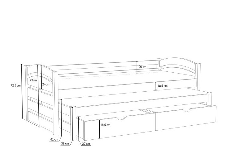 Dětská postel MONI má jak výsuvnou část tvořící druhé lůžko, tak dvě prostorné zásuvky. MONI je postel, která spojuje estetiku s funkčností, prostorností a pohodlím. Bude to ideální místo pro hraní a spánek vašich dětí! MONI je univerzální dětská postel vybavená výsuvnou přistýlkou, díky které se do ní pohodlně vejdou dvě osoby. Minimalistický styl a univerzální tvar zajistí, že nábytek bude vypadat skvěle v každém interiéru. Postel je vyrobena z kvalitního borovicového dřeva, díky čemuž je pevná a odolná proti poškození. U bočnic a čel je šířka použitého materiálu 2,6 cm. Speciálně zaoblená čela s malými mezerami poskytují nejen dodatečné bezpečí, ale dodávají posteli také osobitý šarm. Postel je dodávána se dvěma praktickými šuplíky, které vám umožní mít po ruce to nejnutnější.