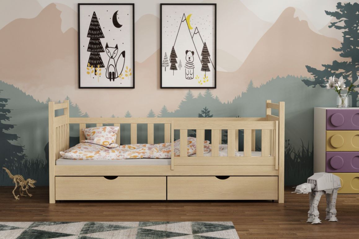 Natálie je klasická jednolůžková postel, která se bude dobře vyjímat v každém dětském pokojíčku. Konstrukce z borovicového dřeva je pevná a odolná a minimalistický vzhled zapadne téměř do každého interiéru. Jednoduchá konstrukce jde ruku v ruce s velmi vysokou odolností a nosností, díky čemuž postýlka bez problémů odolá i dětským hrám. U bočnic a čel je šířka použitého materiálu 2,6 cm. Postel je pokryta lakem na vodní bázi, který nenese riziko zdravotních problémů. Bezpečnost dětí během spánku zajišťuje ochranná bariérka s univerzální možností montáže na pravou i levou stranu postele. Součástí postele jsou dva prostorné šuplíky, které slouží k uložení lůžkovin a hraček a pevný laťkový rošt.